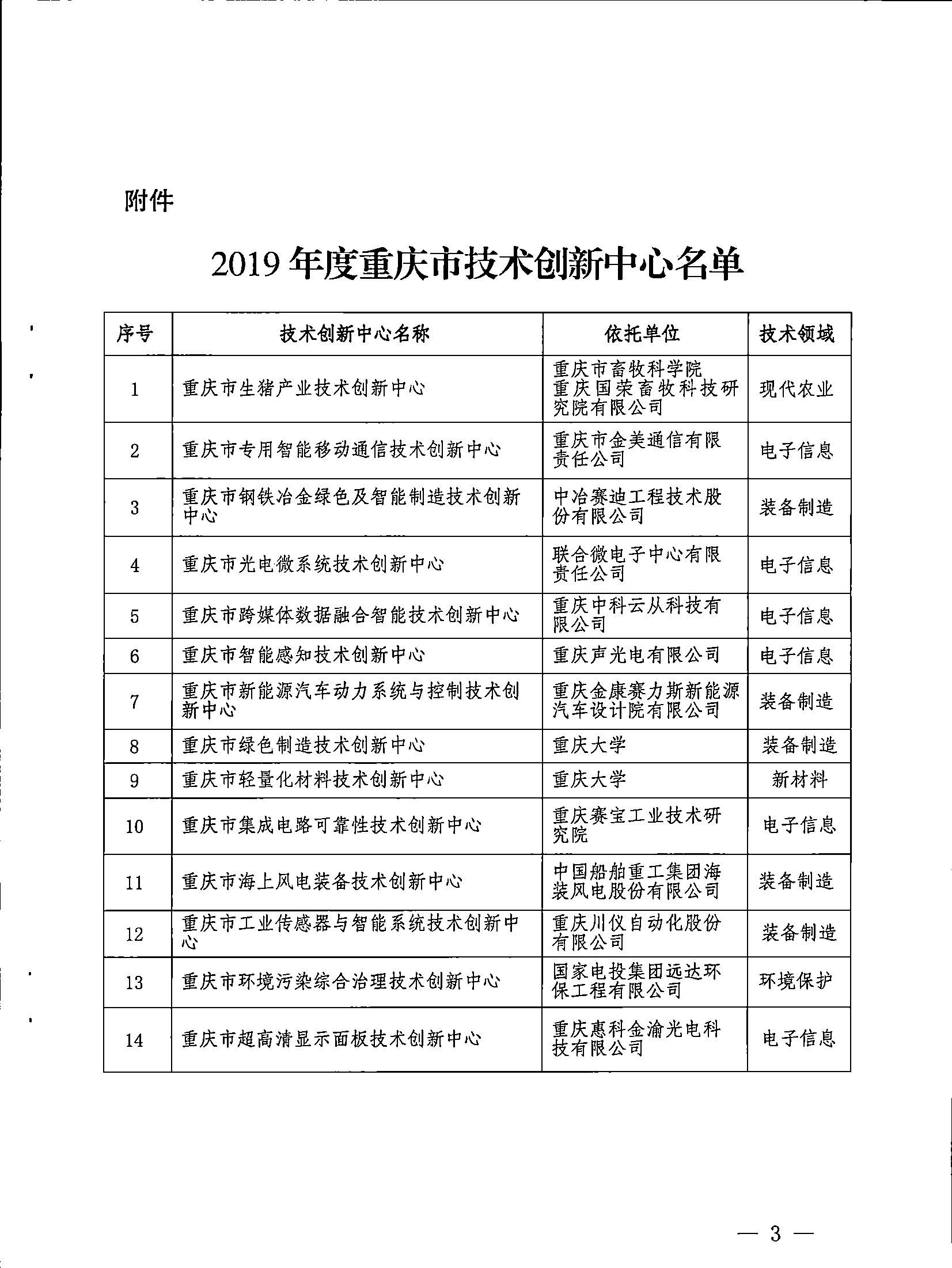 重庆:2019年度市技术创新中心名单