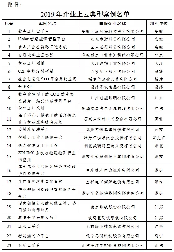 工信部:2019年企业上云典型案例遴选结果公示
