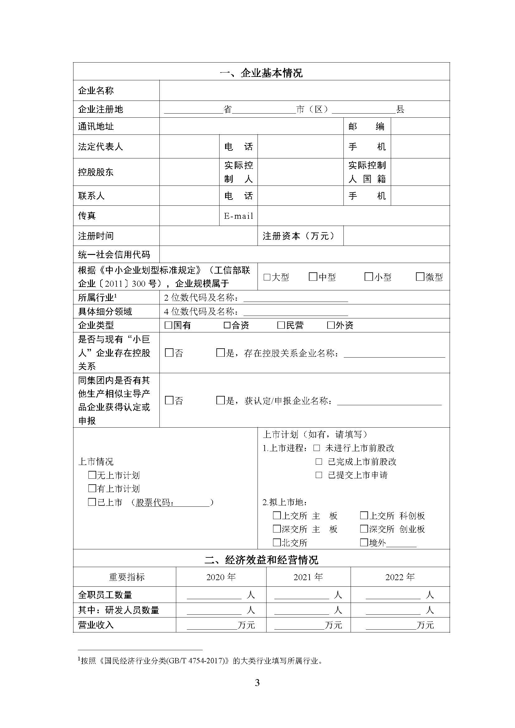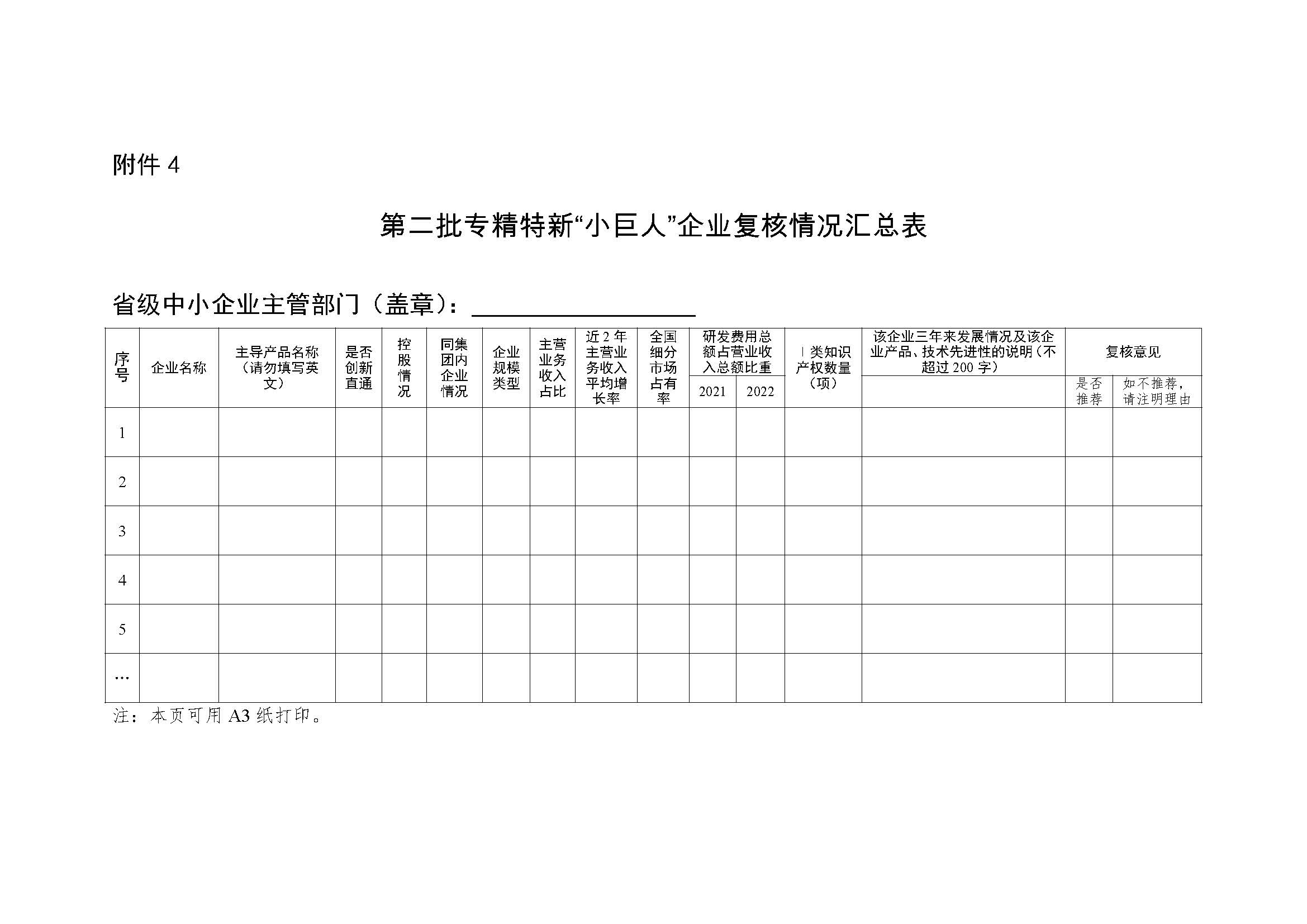 (三)省级中小企业主管部门于2023年5月10日前将加盖公章的正式文件、第五批专精特新“小巨人”企业申请书纸质件(附件1),推荐汇总表(附件3)、复核情况汇总表(附件4,以上均为一式两份),通过邮政特快专递(EMS)邮寄至:工业和信息化部中小企业局(北京市西长安街13号,100804)。