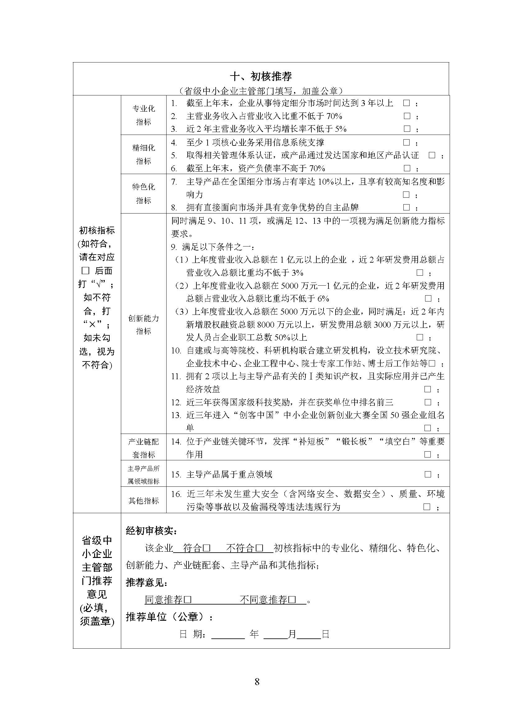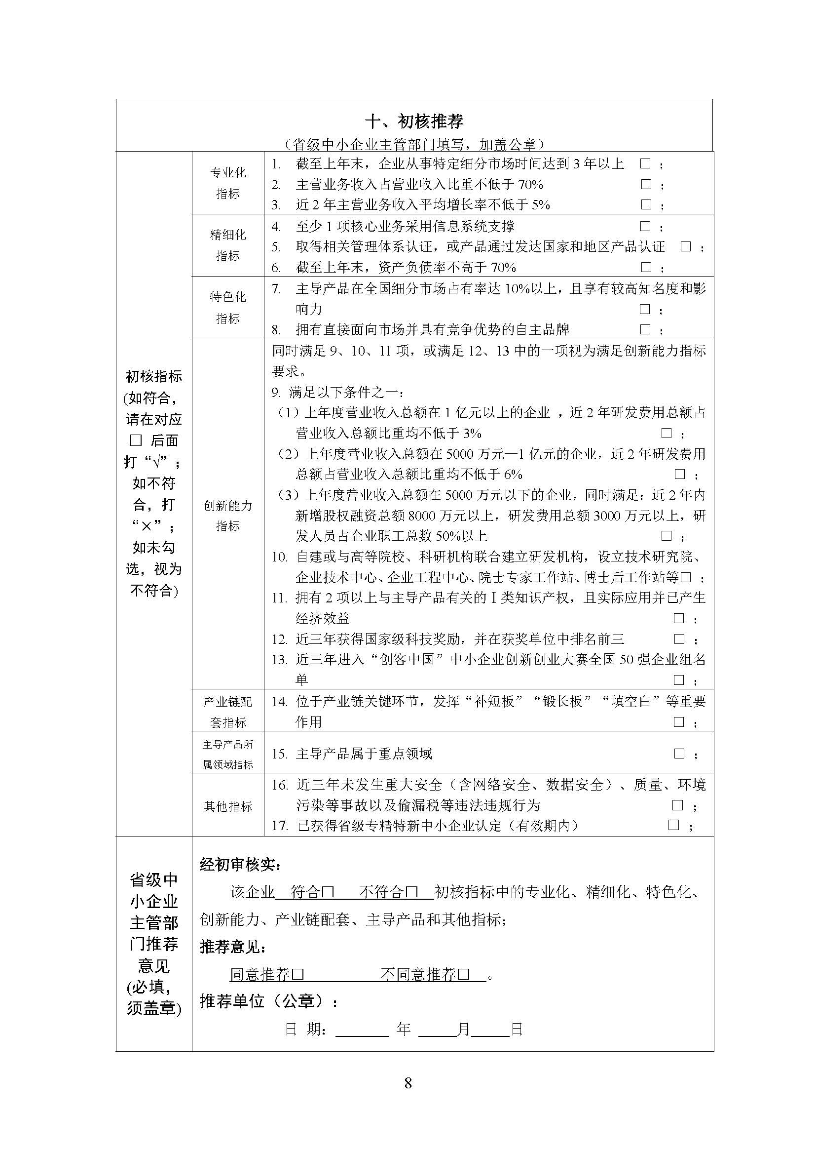推荐和初核。省级中小企业主管部门负责组织第五批专精特新“小巨人”企业初核和推荐工作,择优组织符合条件的企业填写“第五批专精特新‘小巨人’企业申请书”(附件1),初审核实后提出推荐意见。