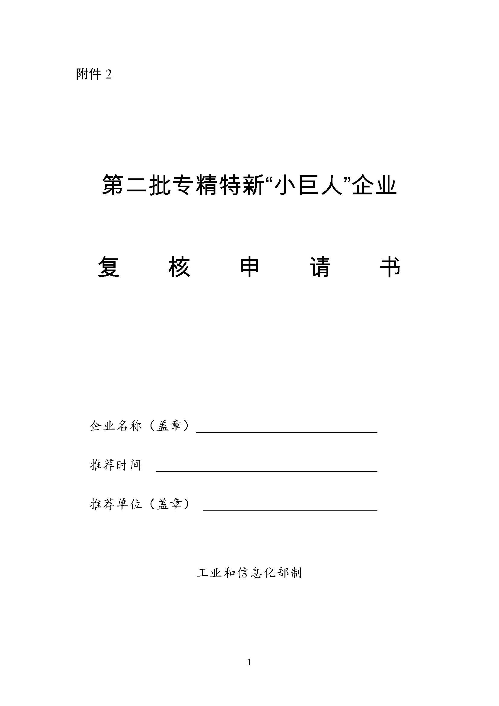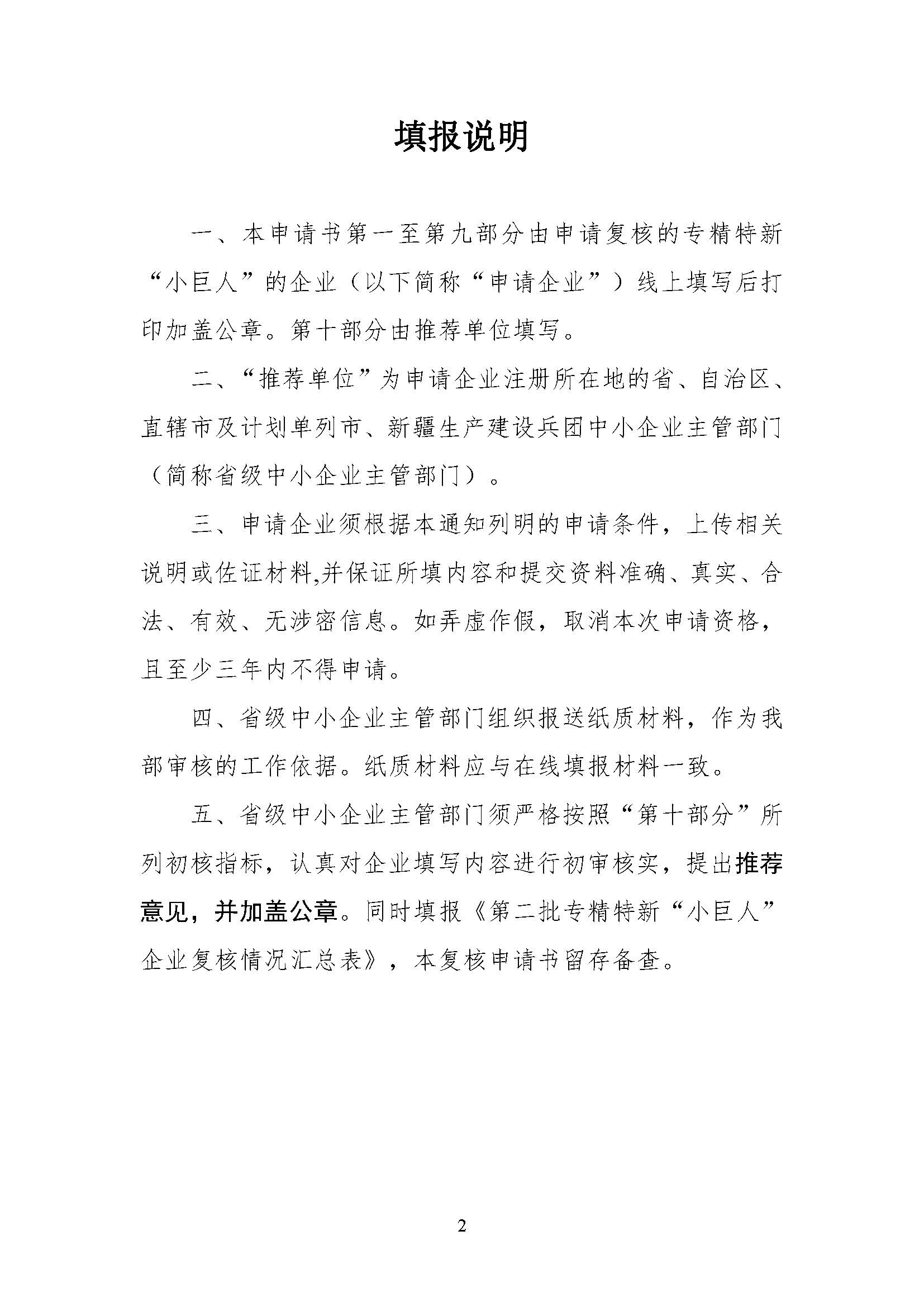 推荐和复核。复核工作以地方为主,省级中小企业主管部门组织第二批专精特新“小巨人”企业填写复核申请书(附件2),并结合工作实际提出复核材料要求。要坚持严标准、进行严把关,通过现场调研与材料审核相结合的方式,按照专精特新“小巨人”企业认定标准逐一审查、核实后,提出推荐意见。对于未推荐的第二批复核专精特新“小巨人”企业,也需说明原因。复核申请书及佐证材料留存备查。