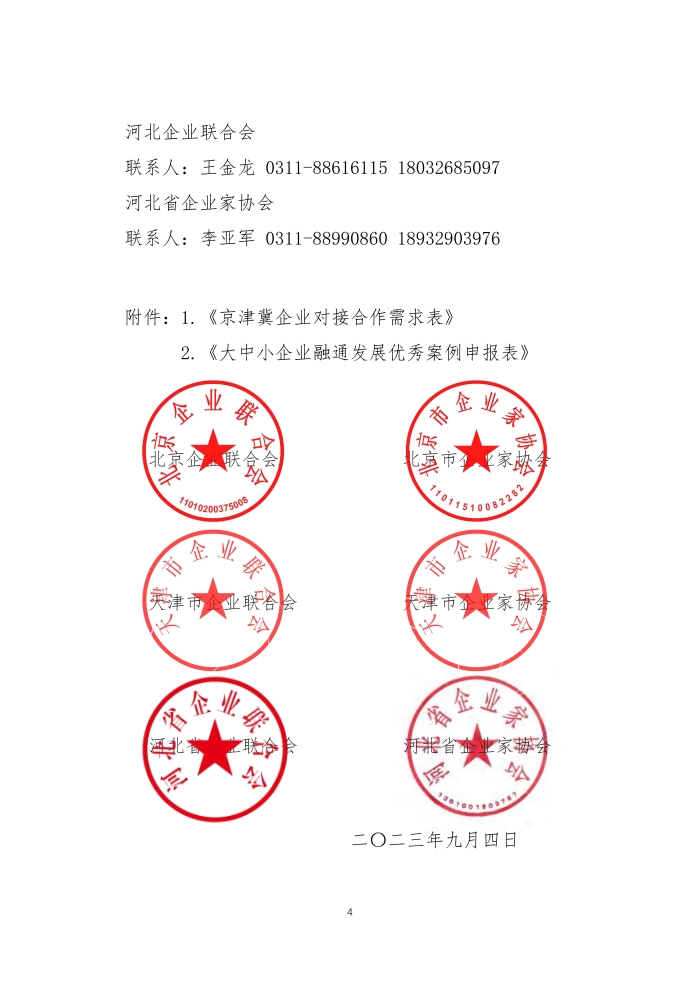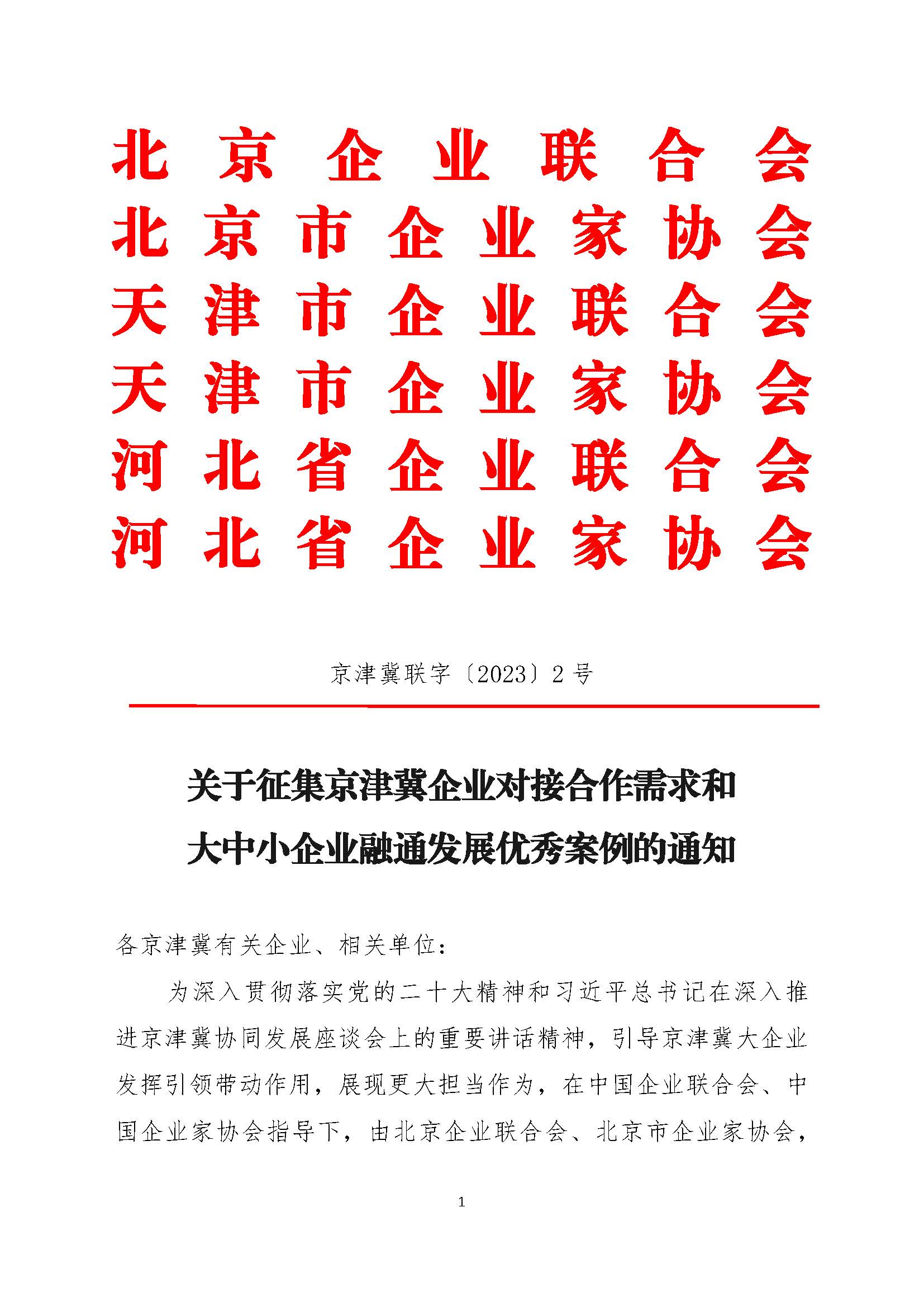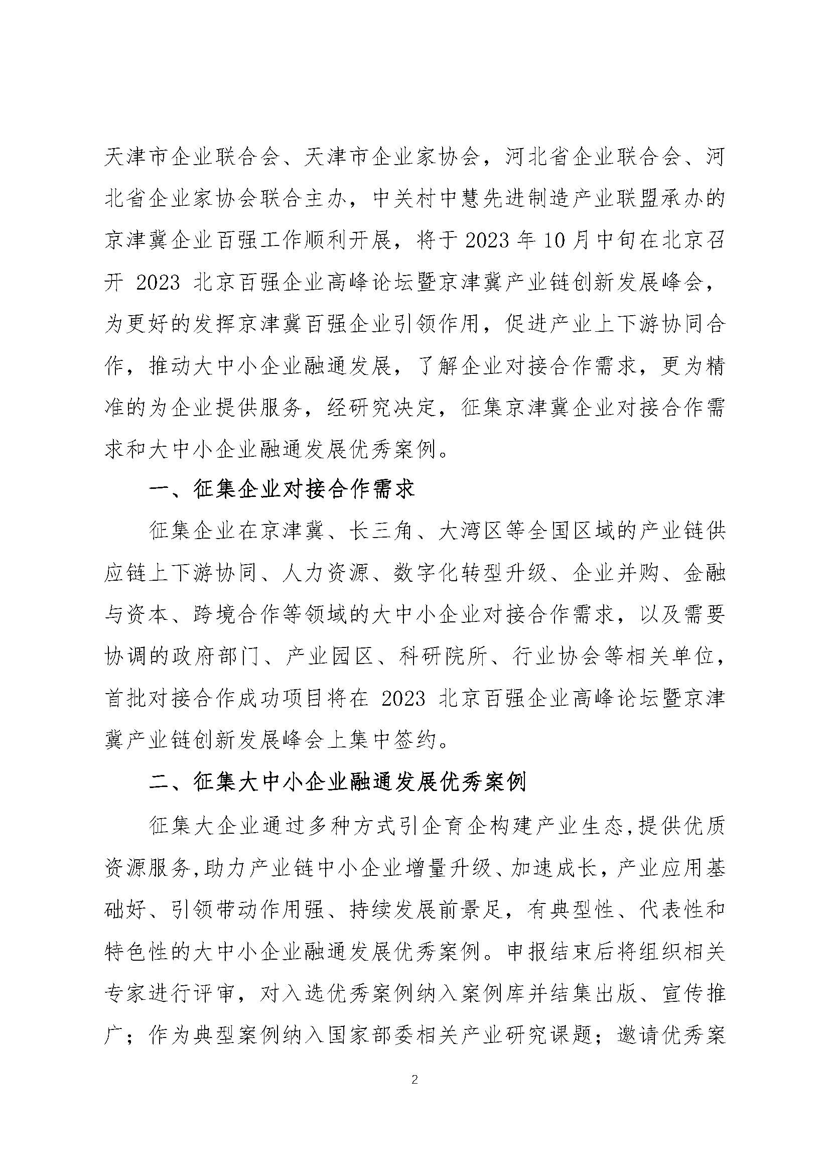 为深入贯彻落实党的二十大精神和习近平总书记在深入推进京津冀协同发展座谈会上的重要讲话精神,引导京津冀大企业发挥引领带动作用,展现更大担当作为,在中国企业联合会、中国企业家协会指导下,由北京企业联合会、北京市企业家协会,北京企业联合会、北京市企业家协会,天津市企业联合会、天津市企业家协会,河北省企业联合会、河北省企业家协会会联合主办,中关村中慧先进制造产业联盟承办的京津冀企业百强工作顺利开展,将于2023 年10 月中旬在北京召开2023 北京百强企业高峰论坛暨京津冀产业链创新发展峰会,为更好的发挥京津冀百强企业引领作用,促进产业上下游协同合作,推动大中小企业融通发展,了解企业对接合作需求,更为精准的为企业提供服务,经研究决定,征集京津冀企业对接合作需求和大中小企业融通发展优秀案例。