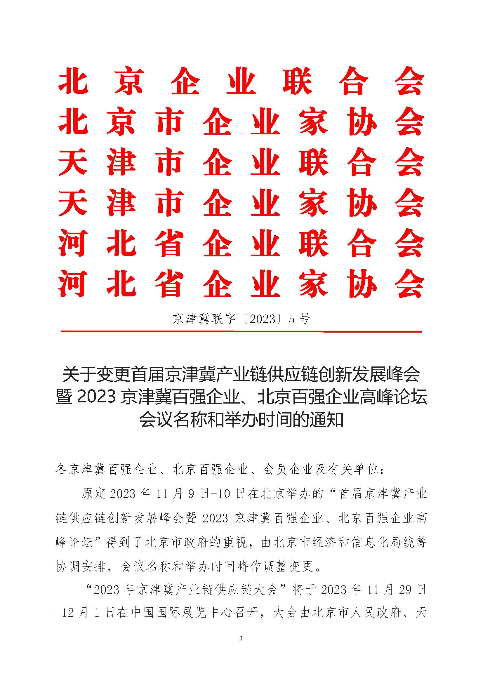 关于变更2023京津冀产业链供应链创新发展峰会暨京津冀百强企业、北京百强企业高峰论坛会议名称和举办时间的通知