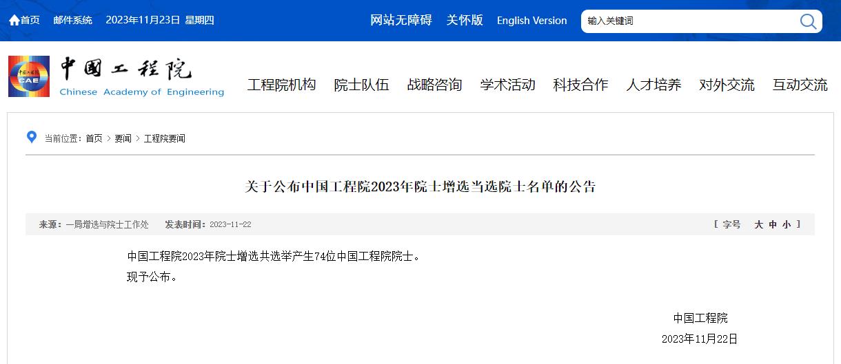 关于公布中国工程院2023年院士增选当选院士名单的公告