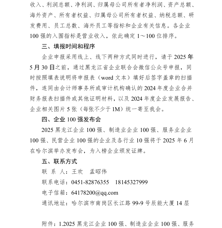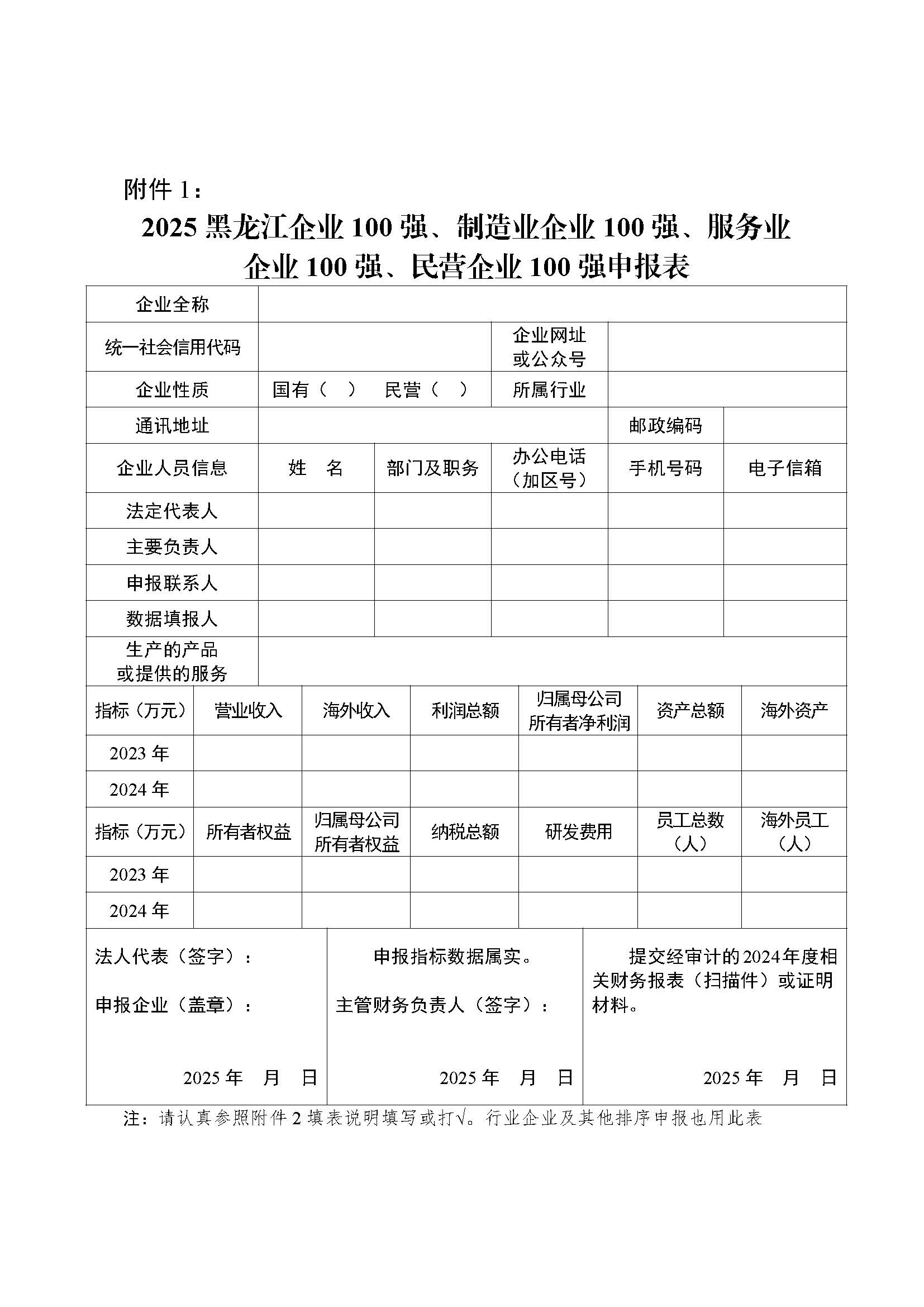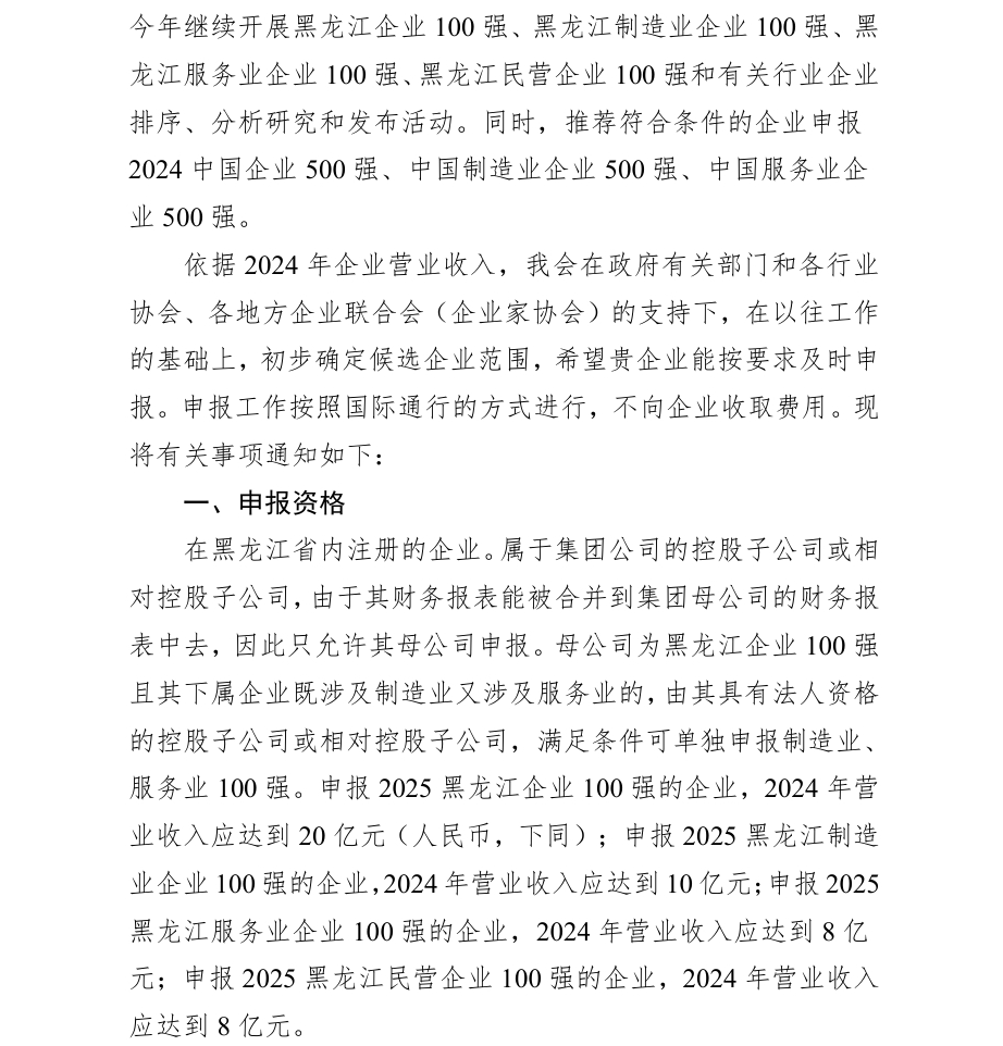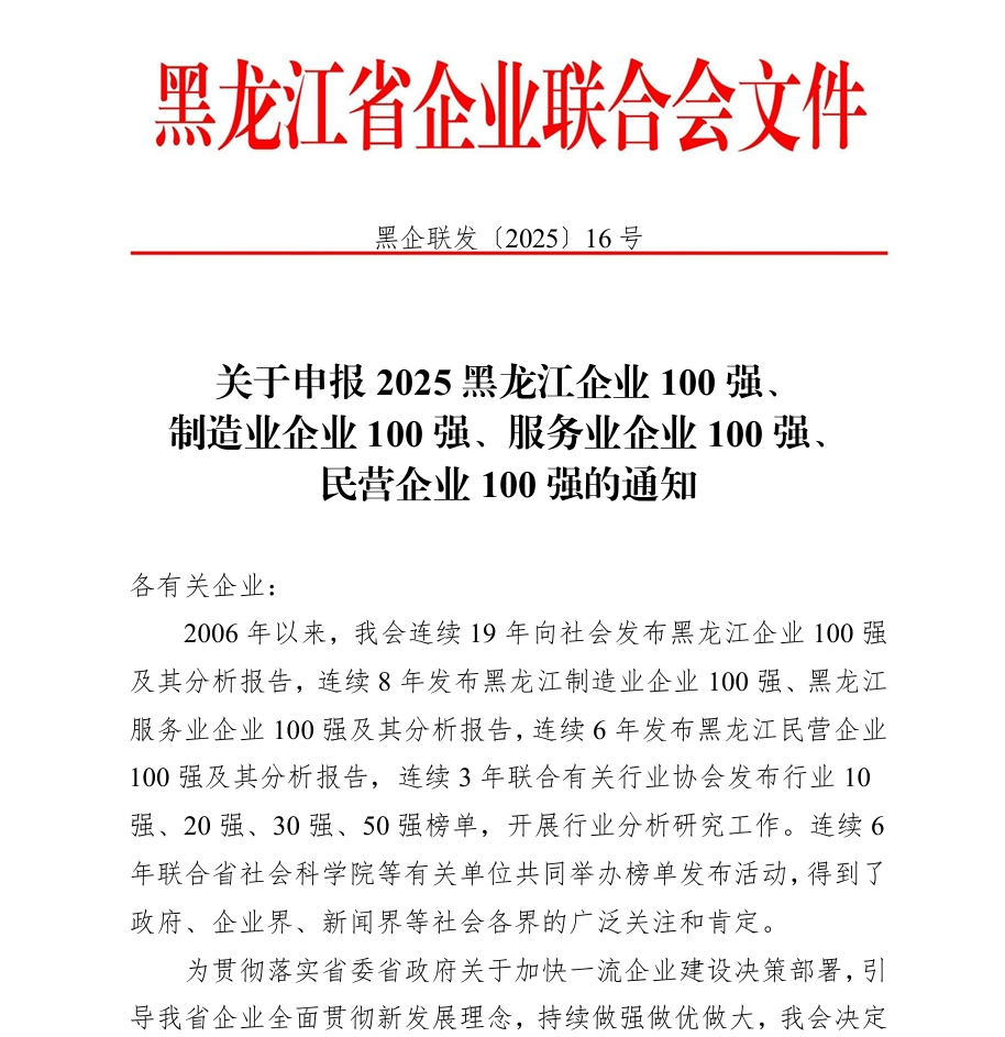 关于申报2025黑龙江企业100强、制造业企业100强、服务业企业100强、民营企业100强的通知
