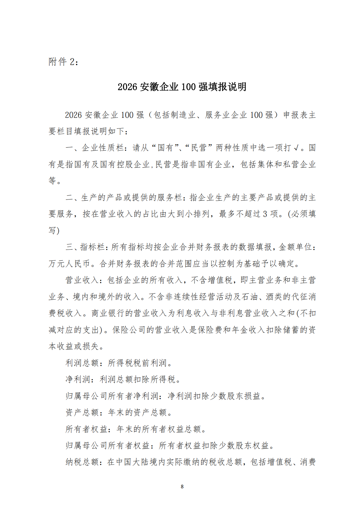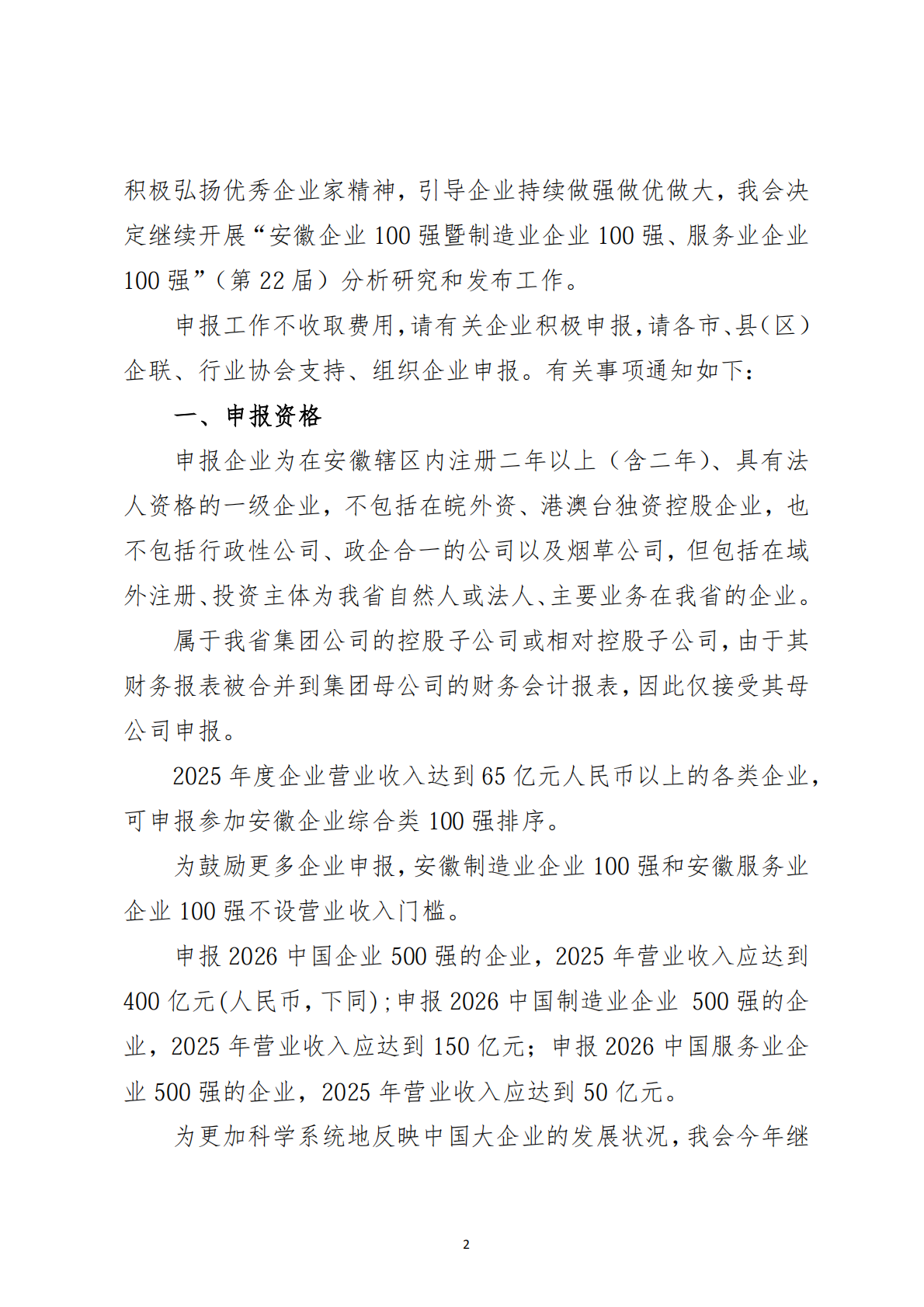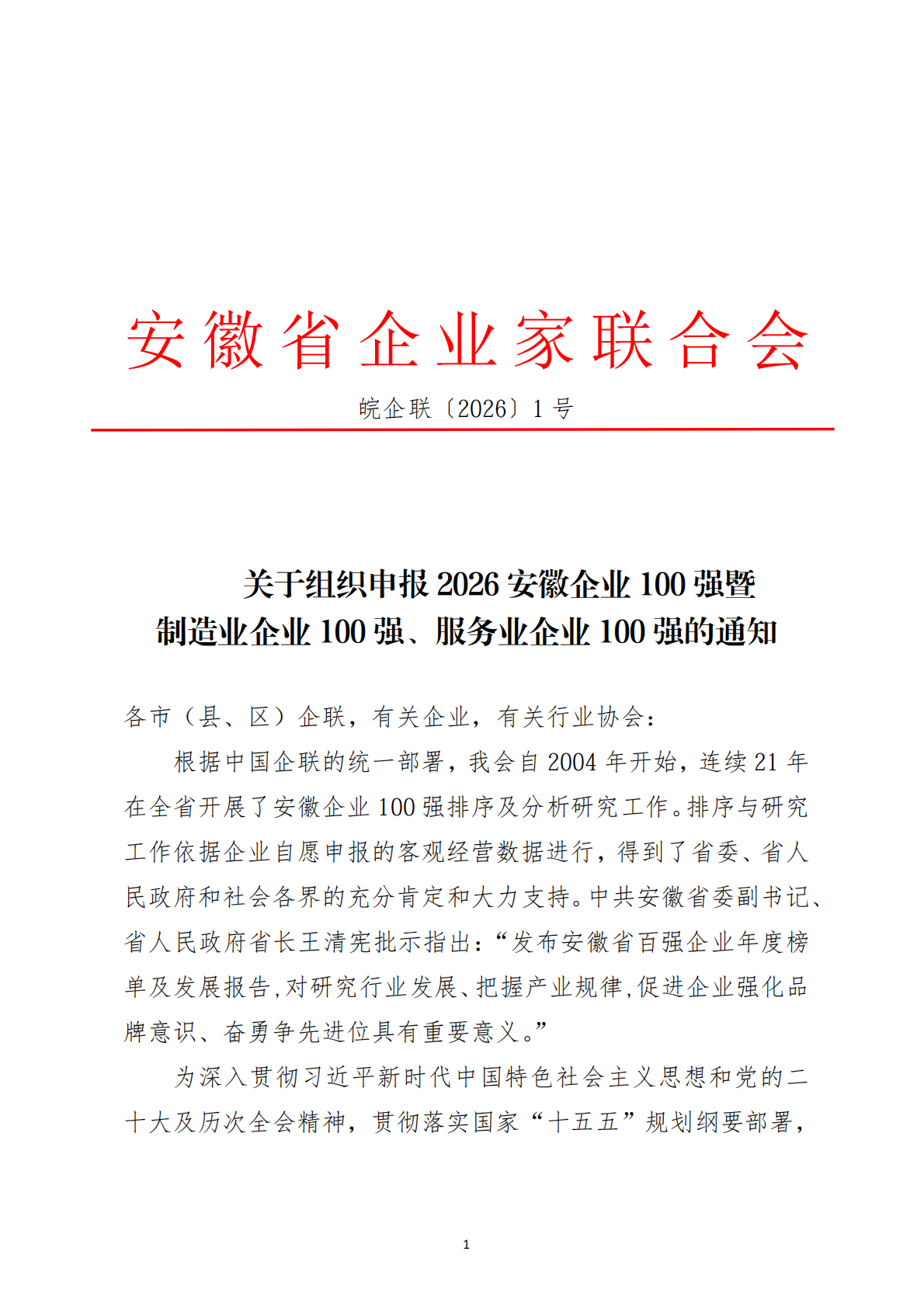关于组织申报2026安徽企业100强暨制造业企业100强、服务业企业100强的通知