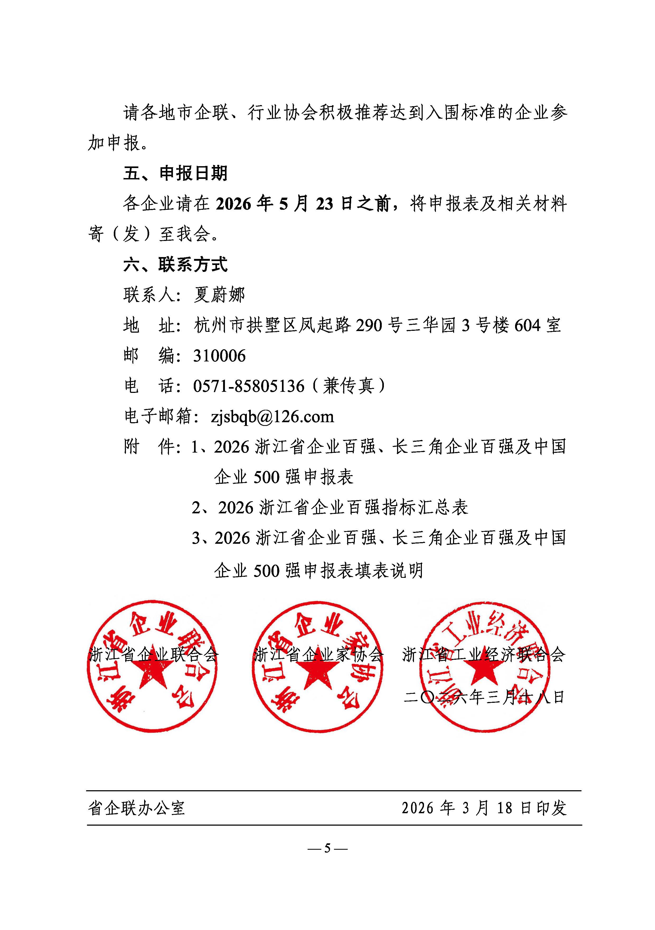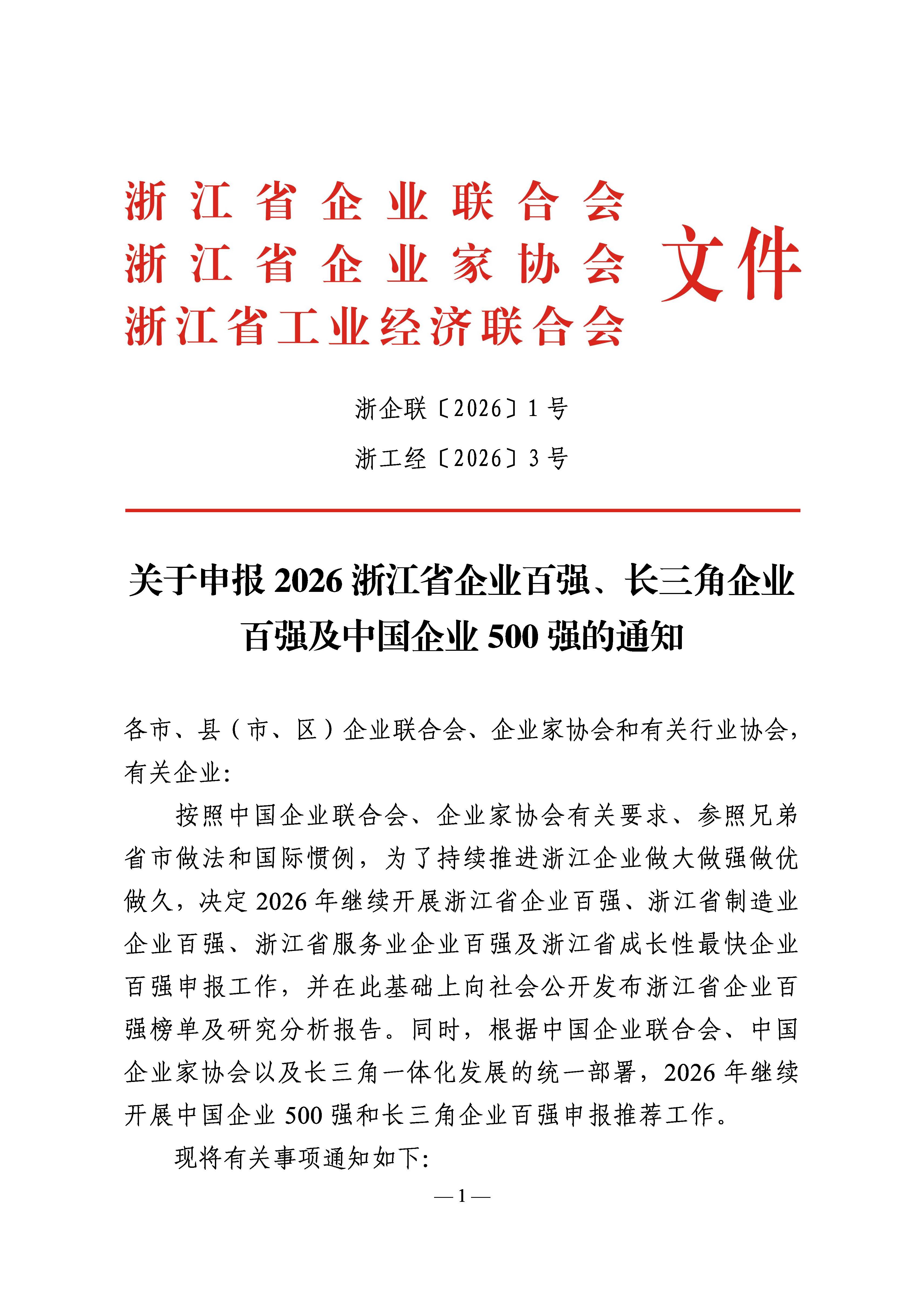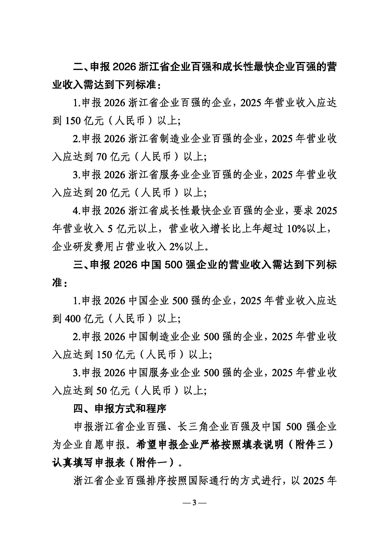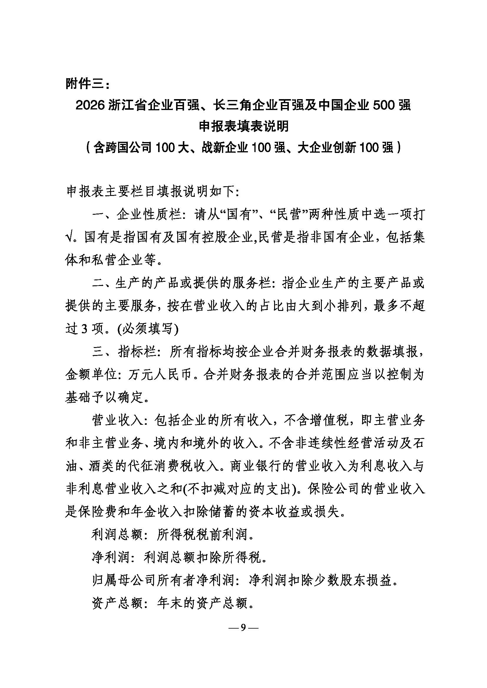 关于申报2026浙江省企业百强、长三角企业百强及中国企业500强的通知