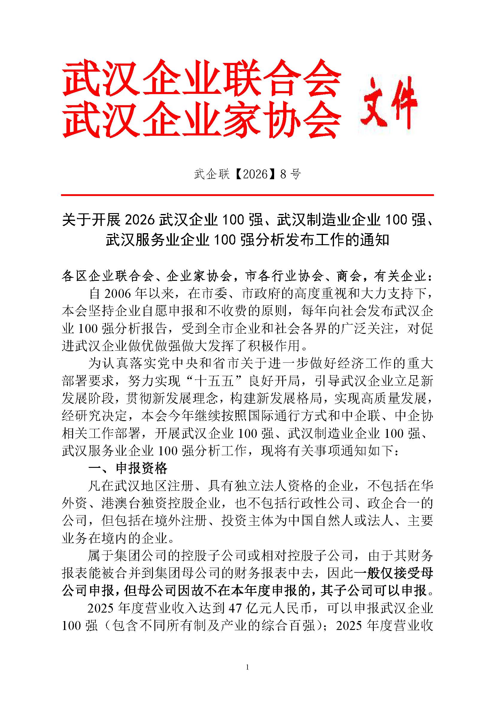 关于开展2026武汉企业100强、武汉制造业企业100强、武汉服务业企业100强分析发布工作的通知