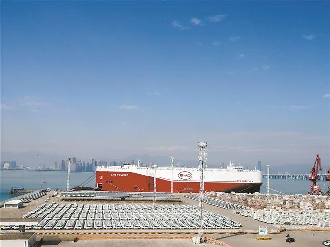 作为比亚迪自营船队中的最大成员,该船拥有9200个标准车位,采用LNG(液化天然气)/燃油双燃料推进系统,并首次应用比亚迪自主研发的厢式电池组与轴带发电机技术,配合高压岸电系统,实现港口停靠期间装卸货全程“零碳排放”。企业自营船队的构建,不仅有效降低物流成本、缩短交付周期,更逐步打破长期以来汽车滚装出口“一船难求”的运输瓶颈。
