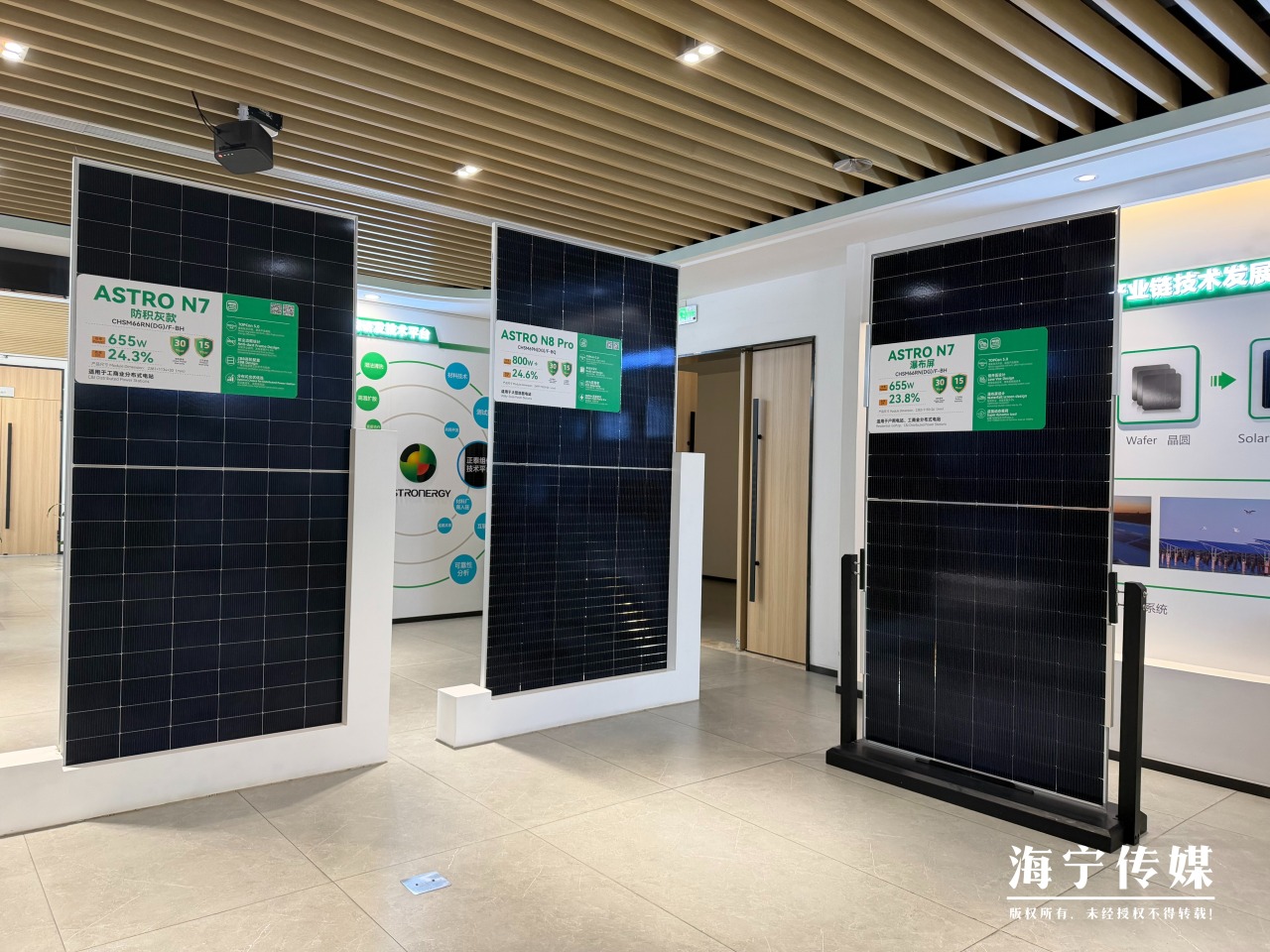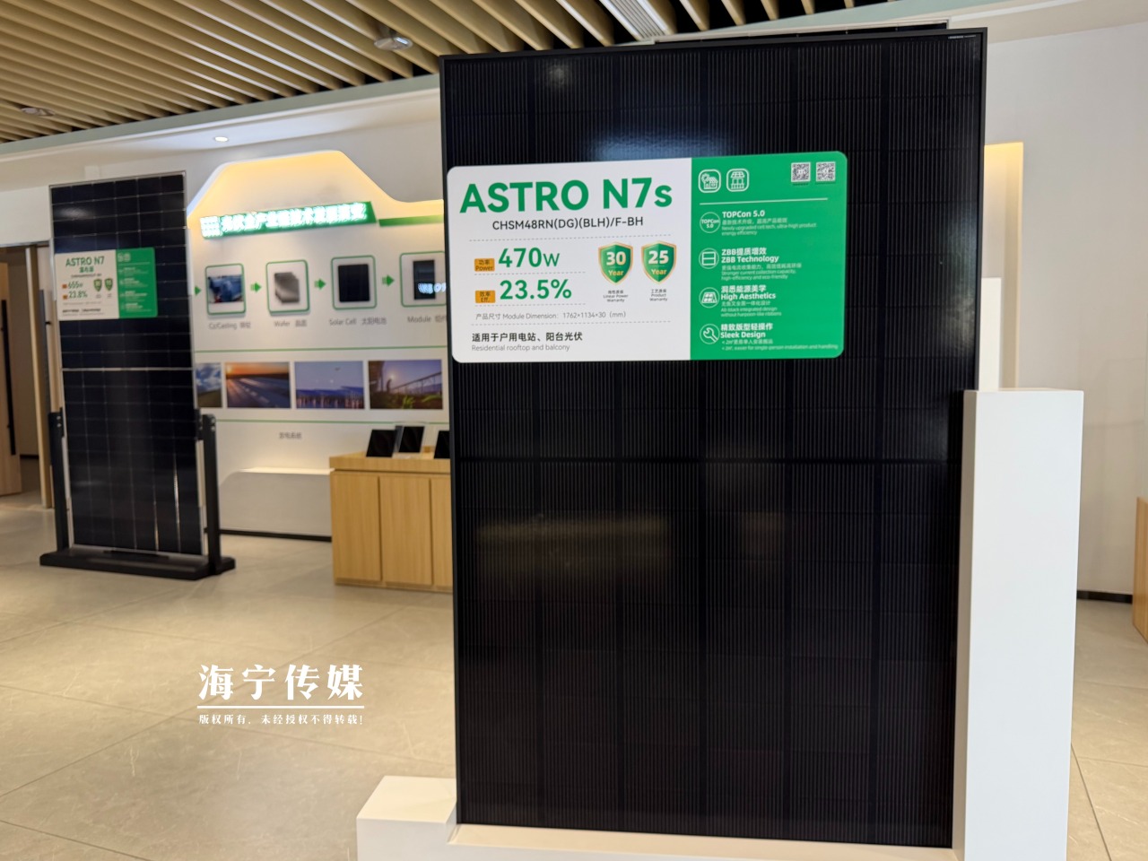 在海宁正泰新能研发中心的展示大厅内,一块由无主栅电池片组成的光伏组件静静陈列,通体黝黑、表面无任何外露线路。“这是全新一代n型TOPCon 5.0技术与ZBB架构的ASTRO N7系列新品组件,全黑一体化设计,实现了高功率、高效率、高可靠性与高颜值的完美融合。”正泰新能科技股份有限公司首席技术官徐伟智指尖抚过组件表面,眼中闪烁着对技术的执着。