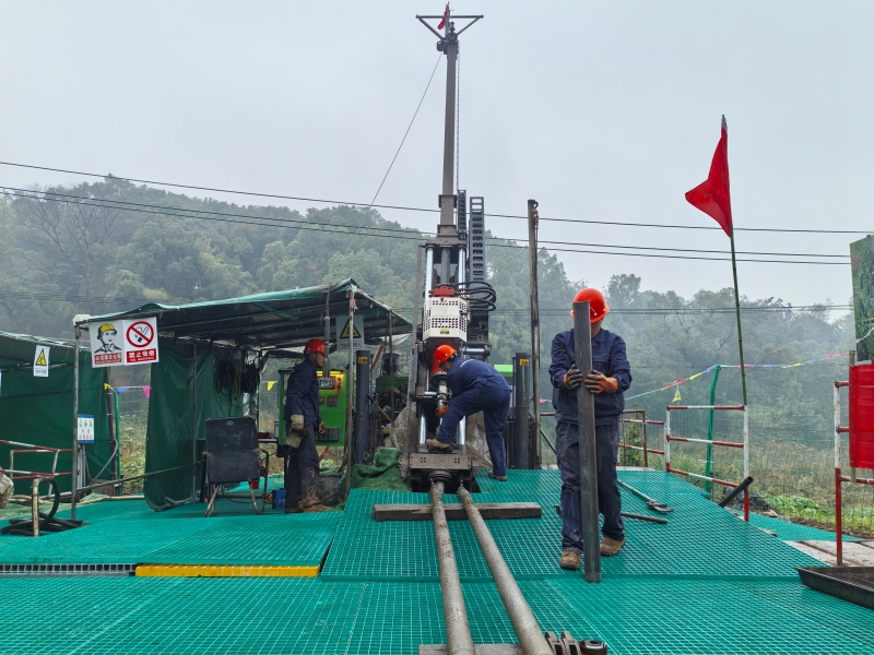 作为服务国家和地方矿产资源安全保障的重点项目,金鸡窝勘查始终锚定 “找大矿、找好矿、找发展急需的矿”核心目标,精准对接全省战略性矿产资源增储上产需求。技术团队充分整合以往地质资料,结合物探、水文地质试验等多手段综合研判,创新采用“绳索取芯配套套管及钻探工艺”技术,在溶洞发育多且复杂的复杂地质条件中攻坚克难。其中最深的勘探孔深达1014.05米,以87度的陡峭倾角向地下延伸,相当于在山体内部“斜穿”338层楼的高度,这样的大角度斜孔在复杂地层中极易发生孔壁坍塌、钻具卡阻等风险,团队通过实时调整钻探参数、优化套管护壁工艺,历时45天昼夜奋战才完成施工;而ZK602孔虽深度320.83米,但其53.5度的设计倾角同样考验着操作精度,队员们需像“穿针引线”般控制钻具轨迹,仅用7天就实现了高效突破。