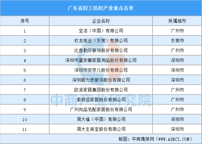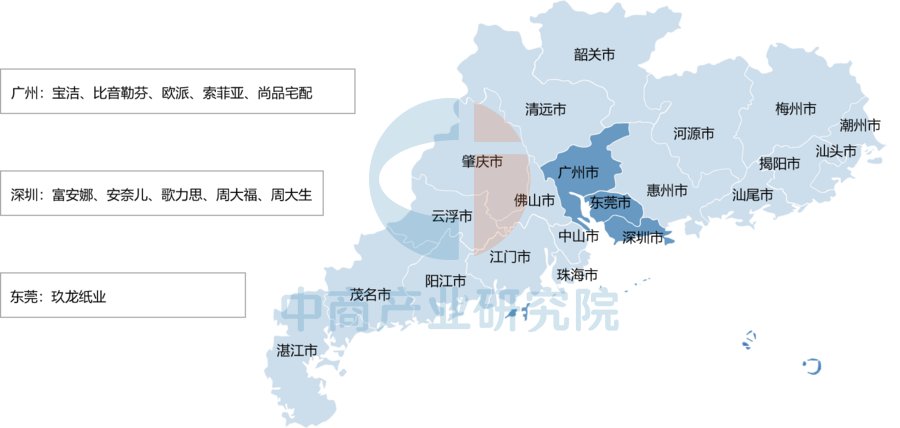 广东轻工纺织龙头企业主要有宝洁、玖龙纸业、比音勒芬、富安娜、安奈儿、歌力思、欧派、索菲亚、尚品宅配、周大福、周大生等。