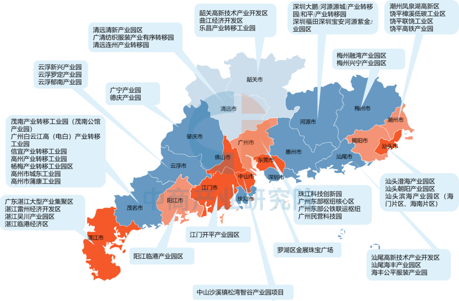 广东轻工纺织重点园区主要分布于广州、肇庆、深圳、潮州、云浮、湛江、汕头、江门、东莞、佛山、中山。