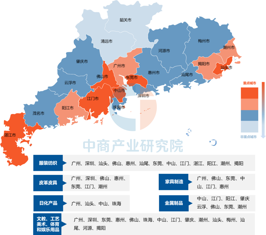 广东轻工纺织产业布局以广州、深圳、江门、中山、潮州、揭阳、阳江等为重点,并且在珠三角核心区、东西两翼形成了一批特色产业集群。