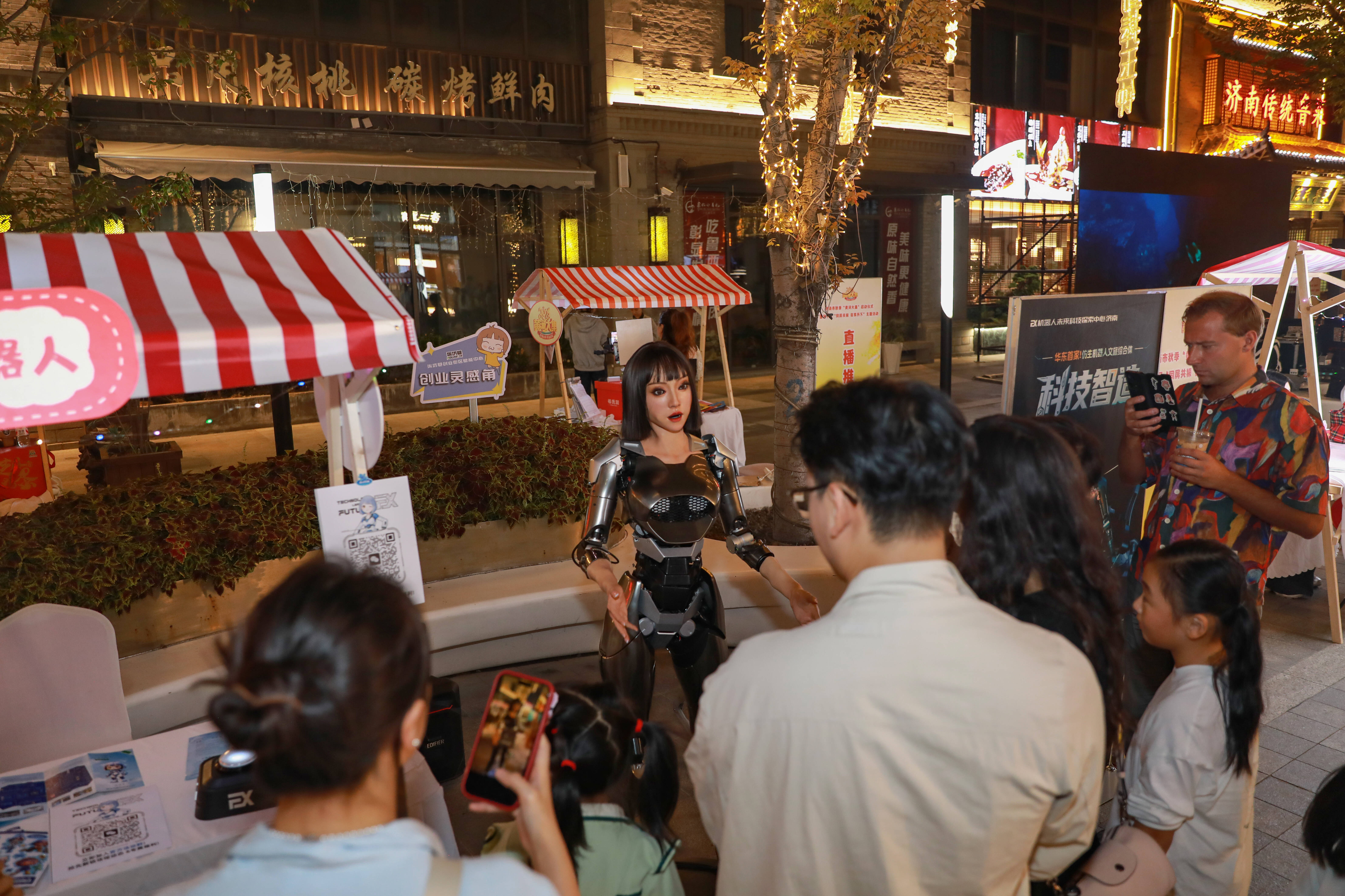 活动现场,黄河大集设置了五类“夜享历下”特色市集。企业展示区展示特色企业及新兴消费业态品牌,彰显历下区在商业创新与品牌孵化方面的强劲动力。非遗体验区邀请文玩手作、手工编制等非遗传承人现场演示精湛技艺,与游客交流互动。助农展销区链接济南周边优质农特产品,以“原产地直供”形式展销,让优质农产品走进城市餐桌,带动农民增收。直播推介区邀请济南探店主播推介历下好物,进一步提升好物知名度。科技体验区邀请EX未来科技探索中心进行机器人等产品展示,打造集互动性、趣味性与未来感于一体的沉浸式空间。此外,红色电影区为市民及游客播放红色主题公益电影,在光影交织中共庆祖国华诞。