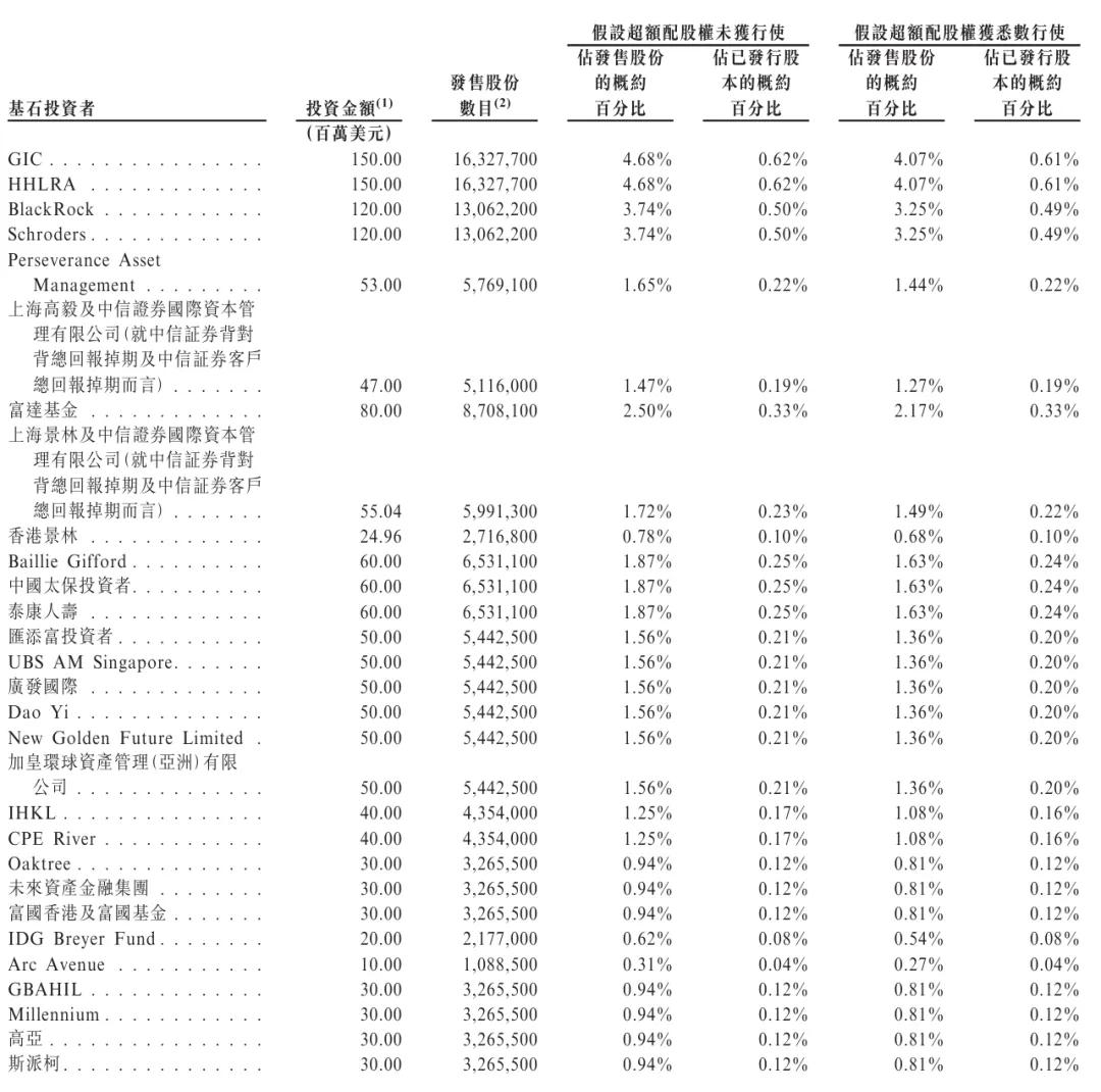 Baillie Gifford、中国太保投资者、泰康人寿认购6000万美元,汇添富投资者、UBS AM Singapore、广发国际、Dao Yi、New Golden Future、加皇环球资产管理(亚洲)有限公司分别认购5000万美元;