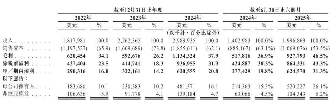 招股书显示,紫金黄金2022年、2023年、2024年营收分别为18.18亿美元、 22.62亿美元、29.9亿美元;毛利分别为6.2亿美元、5.93亿美元、11.34亿美元;毛利率分别为34.1%、26.2%、37.9%。