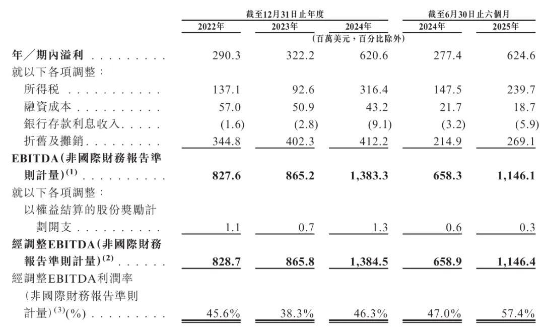 紫金黄金2022年、2023年、2024年经调整EBITDA分别为8.29亿美元、8.66亿美元、13.84亿美元;经调整EBITDA分别为45.6%、38.3%、46.3%;2025年上半年经调整EBITDA为11.46亿美元,上年同期为6.58亿美元;经调整EBITDA率为57.4%,上年同期为47%。
