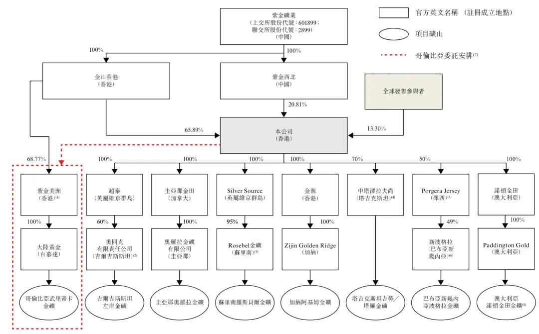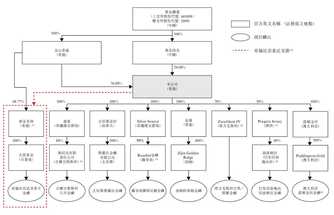 截至最后可行日期,紫金黄金在中亚、南美洲、大洋洲和非洲等黄金资源富集区持有8座黄金矿山的权益,即塔吉克斯坦吉劳╱塔罗金矿、吉尔吉斯斯坦左岸金矿、澳大利亚诺顿金田金矿、圭亚那奥罗拉金矿、哥伦比亚武里蒂卡金矿(透过哥伦比亚委托安排)、苏里南罗斯贝尔金矿、加纳阿基姆金矿及巴布亚新几内亚波格拉金矿。