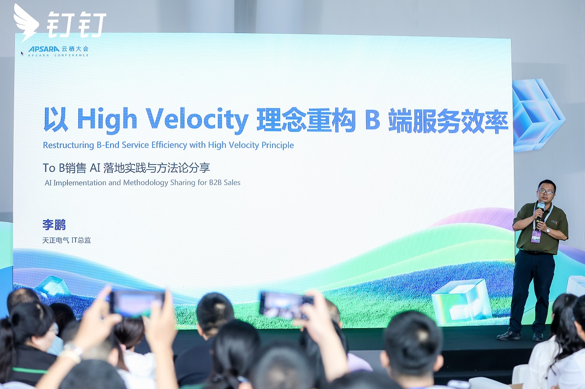 在以“AI时代的工作方式”为主题的云栖专场论坛上,天正电气信息部李总监受邀做主题分享,向与会嘉宾分享了《以 High Velocity 理念重构 B 端服务效率-To B销售AI落地实践与方法论》,以及天正在AI时代的数智化创新实践成果。