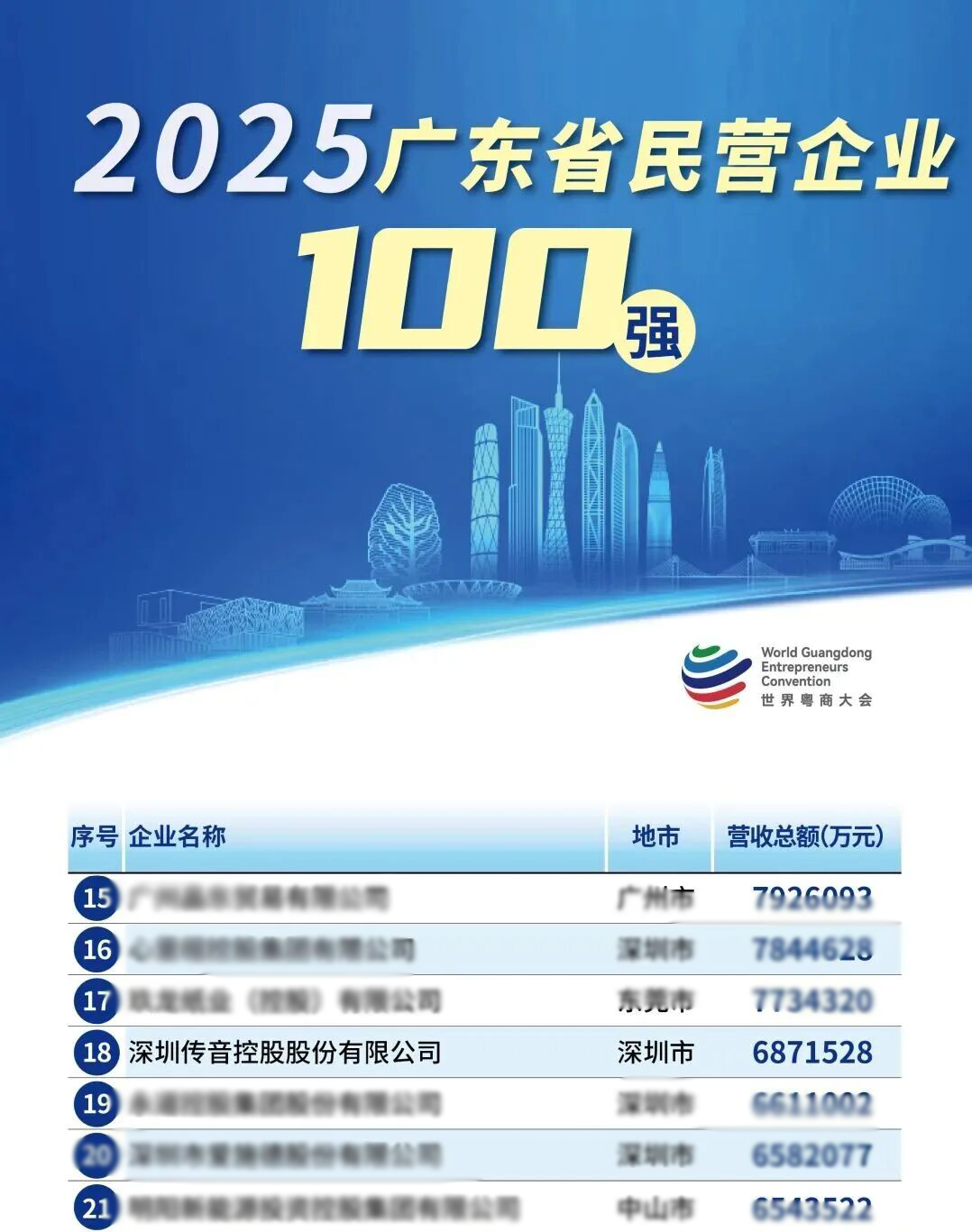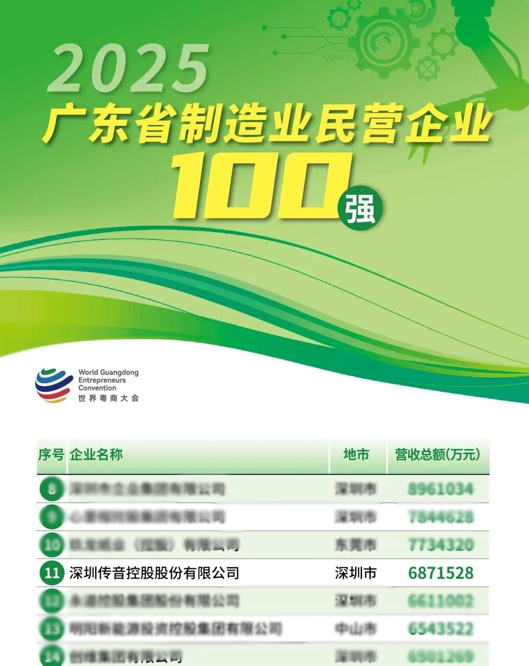 排名提升,传音控股位列“2025广东省民营企业100强”第18名