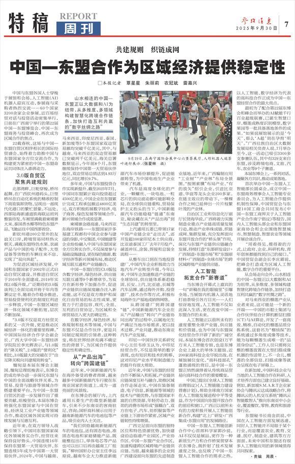 新闻眼9月30日,《参考消息》第7版刊发《共建规则织链成网中国—东盟合作为区域经济提供稳定性》,全文如下: