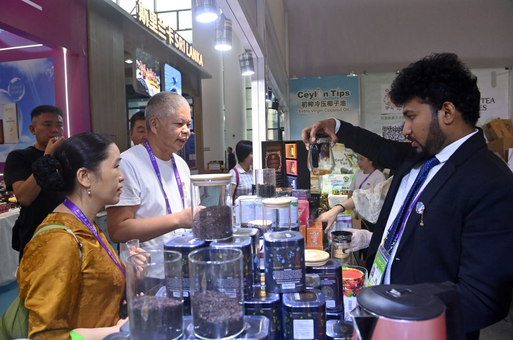 9月19日,在广西南宁国际会展中心斯里兰卡展馆,参展商(右)在向顾客推荐商品。陆波岸摄