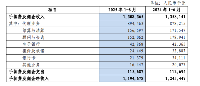 具体来看,利息收入为209.92 亿元,同比减少7.46%;手续费及佣金净收入11.95 亿元,同比下降4.08%。其中:结算与清算业务手续费及佣金收入1.57 亿元,同比下降8.66%;顾问与咨询业务手续费及佣金收入1.52 亿元,同比下降15.02%。