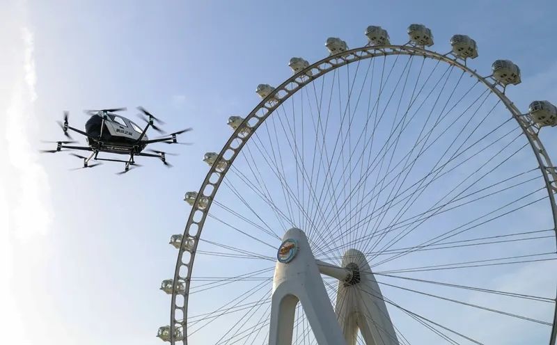在深圳市宝安区城市空中交通运营示范中心,亿航eVTOL航空器进行展示飞行。