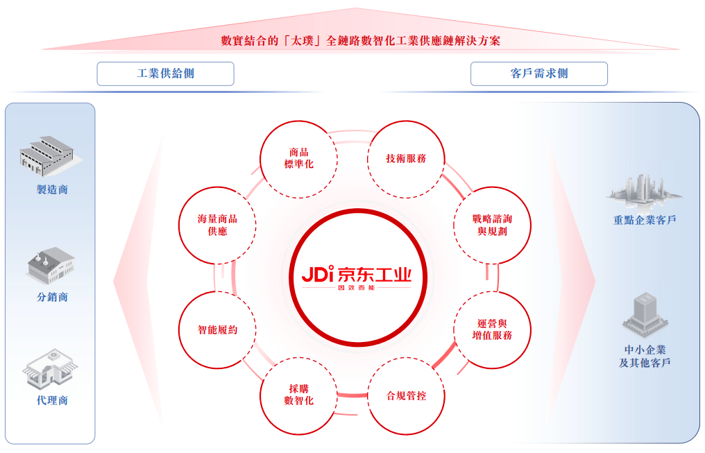 京东工业定位为工业供应链技术与服务提供商,通过“太璞”全链路数智化工业供应链解决方案,提供工业品供应和供应链服务,目标是帮助客户实现保供、降本、增效、合规。