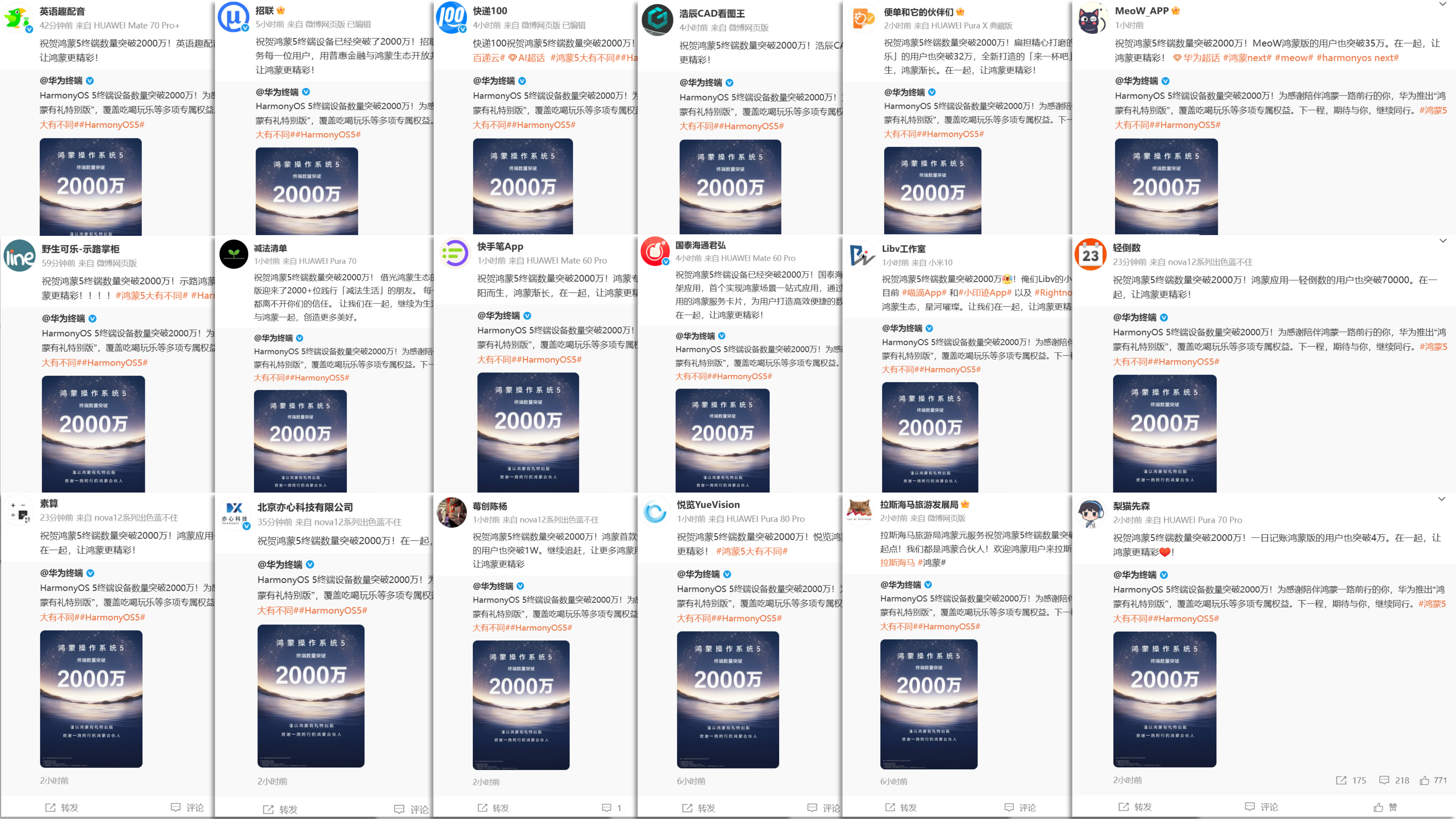 9月29日,华为官方微博宣布,HarmonyOS 5终端设备数量历经两年发展已突破2000万台,近两个月更是增长了1000万。2000万终端设备,不仅是“鸿蒙速度”的又一重要里程碑,更是伙伴、用户与鸿蒙共建、共享“养成系”生态的生动注解。华为官方消息发布后,迅速在社交平台引发热烈响应。来自社交、出行、办公、娱乐、金融等多个领域的超百家合作伙伴纷纷转发互动,共同见证并祝贺这一关键时刻。