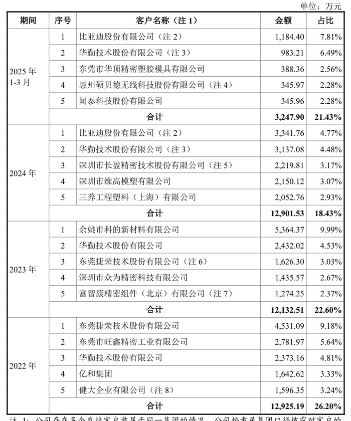 公司同时说明,存在多个直接客户同属于一个大型集团的情况,因此在披露时已按集团合并口径统计销售收入。例如,2025年一季度的第一大客户比亚迪,其销售额便包含了比亚迪供应链管理公司、比亚迪汽车工业公司及其关联方的总和。