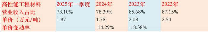 然而,界面新闻记者发现,作为营收支柱的“高性能工程材料”的销售单价正面临持续下滑的压力。该产品2022年的均价为2.54万元/吨,2023年降至2.08万元/吨,到2024年进一步下滑至1.78万元/吨。这意味着在两年时间内,该主力产品售价累计跌幅接近30%,相当于打了“七折”。尽管2025年一季度价格小幅回升至1.87万元/吨,但整体下行趋势明显。