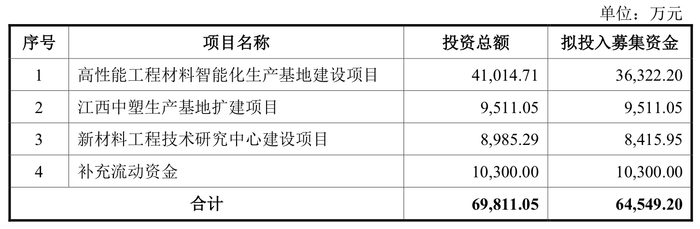 本次IPO,中塑股份计划募集资金总额6.45亿元,拟投向三个实体项目及补充流动资金。具体包括:“高性能工程材料智能化生产基地建设项目”(投资额3.63亿元)、“江西中塑生产基地扩建项目”(投资额9511.05万元)、“新材料工程技术研究中心建设项目”(投资额8415.95万元),以及补充流动资金1.03亿元。