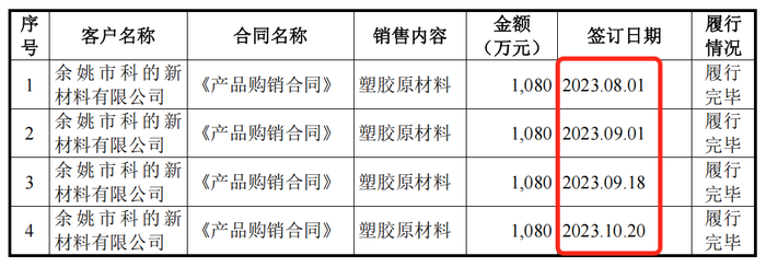 通过进一步查询余姚市的这家公司信息,界面新闻发现,该公司成立于2021年5月,注册资本仅为50万元。这意味着,在公司成立仅一年半之后,它便一跃成为中塑股份的第一大客户,而2023年恰好是中塑股份启动上市辅导的年份。根据披露,自2023年6月开始与中塑股份发生业务往来后,余姚市的这家公司在随后短短三个月内(2023年6月至10月),便接连下达了多笔大额订单,锁定了超过4000万元的销售金额。