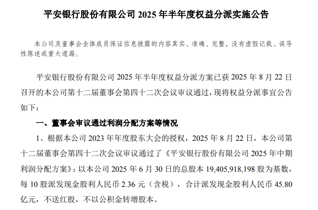 以平安银行2025年6月30日的总股本194.06亿股为基数,每10股派发现金股利人民币2.36元(含税),合计派发现金股利人民币45.80亿元,不送红股,不以公积金转增股本。