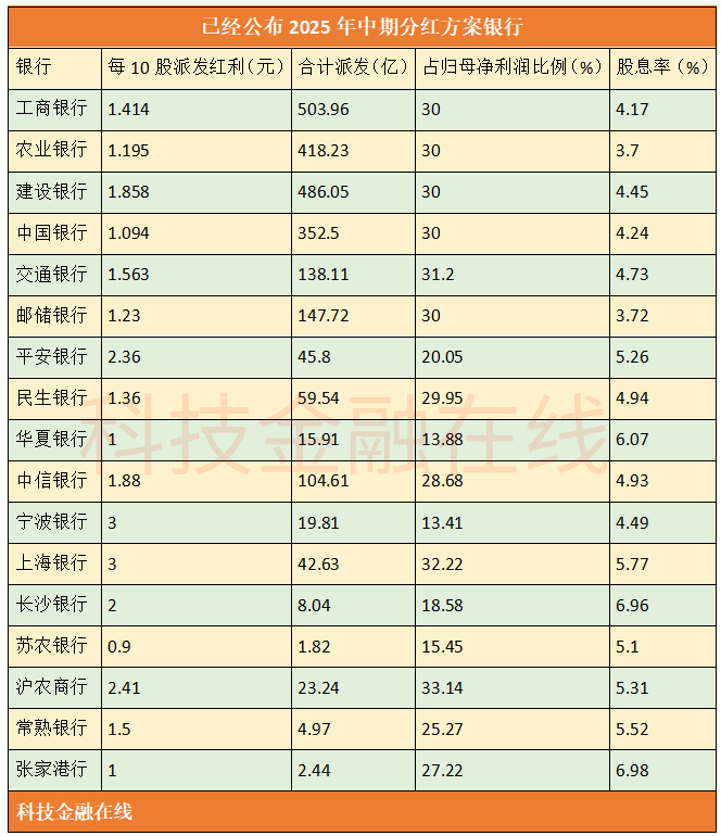 包括平安银行和上海农商行,目前已经有17家银行公布了2025年中期具体分红方案,尚未公布分红具体日期。招商银行公布了中期利润分配现金分红金额,占归母净利润比例为35%,分配现金分红时间为2026年1月至2月之间。
