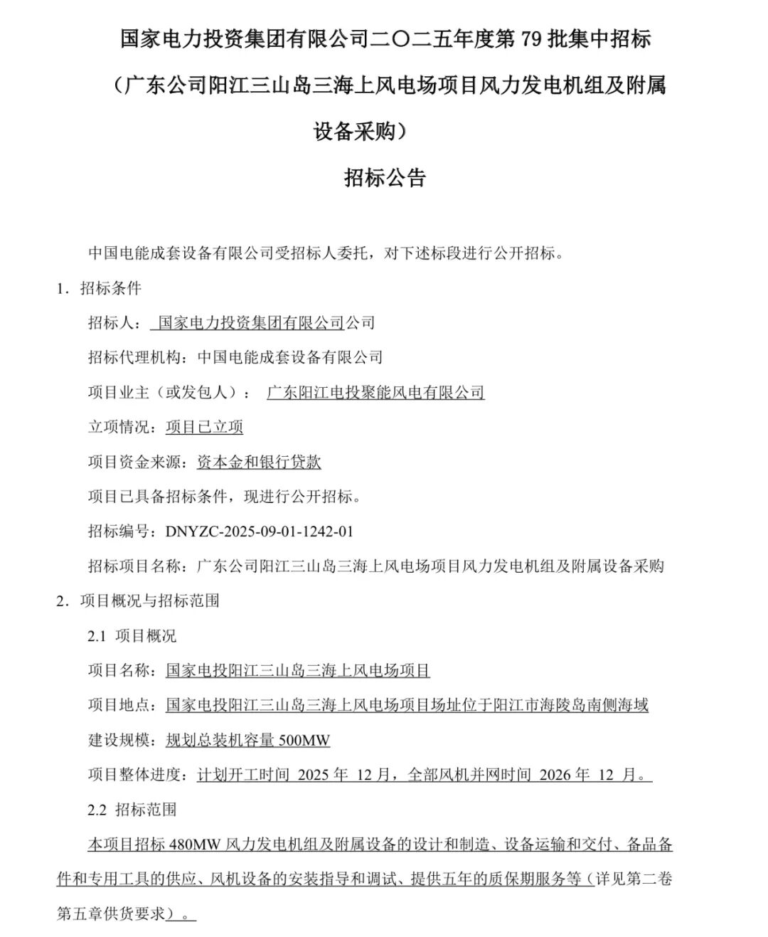 「风电之音」获悉,9月29日,国家电力投资集团有限公司二〇二五年度第79批集中招标(广东公司阳江三山岛三海上风电场项目风力发电机组及附属设备采购)招标公告发布。