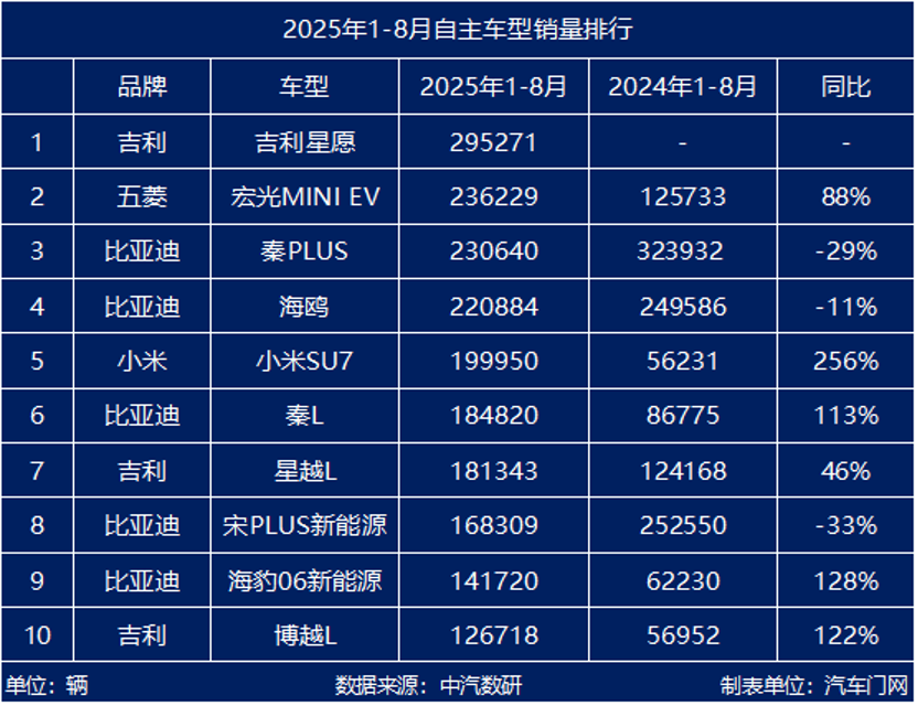 整体看下来,自主阵营中的车型呈现分化加剧的态势。其中,比亚迪旗下秦PLUS、海鸥、宋PLUS新能源等车型出现不同程度下滑,虽有秦L、海豹06新能源等新车型增长弥补,但也反映出其“老款车型面临竞争、需靠新品驱动”的现状;而吉利、五菱、小米等品牌则凭借新车型或差异化定位实现增长。