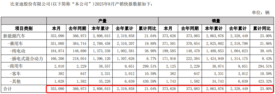 根据比亚迪销量数据,其7月、8月销量同比增速大幅收窄,分别降至0.56%和0.15%,销量规模与上年同期基本持平。