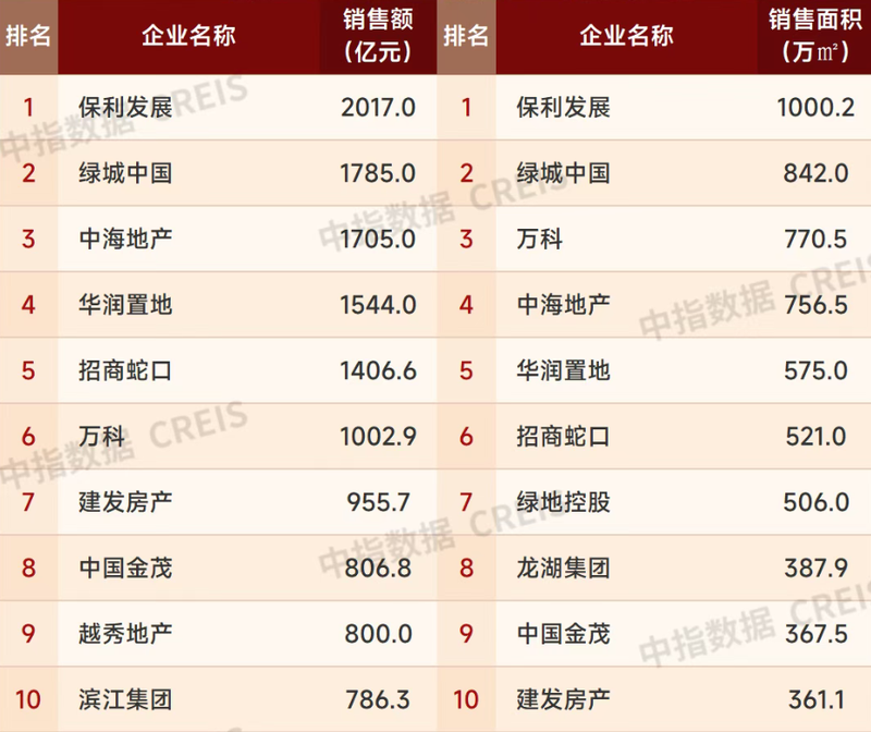 今年前三季度,房企销售哪家强?9月30日,中指研究院、克而瑞研究中心分别发布了2025年前9个月房地产企业销售额(全口径)排行榜,其中,保利发展以2017亿元位居首位,也成为百强房企中唯一一家破2000亿元的房企。