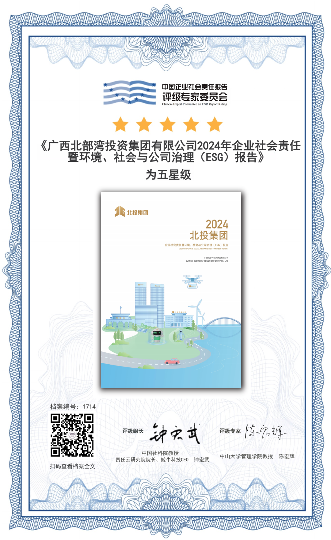 近日,北投集团自主编制的首份《2024年企业社会责任暨环境、社会与公司治理(ESG)报告》,获中国企业社会责任报告评级专家委员会评为“五星级(卓越)”。作为北投集团编制的首份ESG报告,即取得卓越等级评价,体现了评级专家对北投集团在可持续发展方面的扎实实践与系统管理的认可。