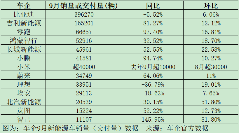 9月交付量同样创新高的是小鹏、小米,分别为4.16万辆、超4万辆。