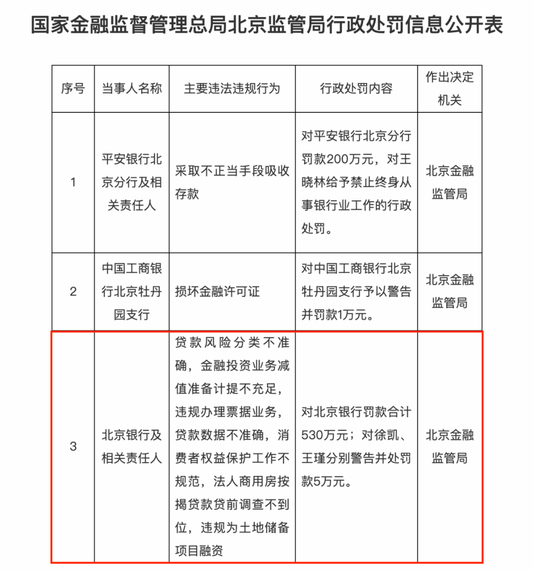 为此, 北京银行 被处以530万元罚款,另对责任人徐凯、王瑾分别处以警告并罚款5万元。