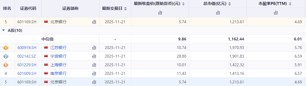 从11月21收盘后的最新市值来看, 江苏银行 以1971亿元位列榜首, 宁波银行 以1902亿元位列第二, 北京银行 以1214亿元位列第五。