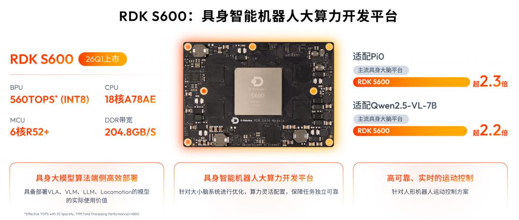 其中,S600 具身智能机器人大算力开发平台,拥有 560 TOPS*( INT8 )算力,采用高效灵活的「大小脑」架构设计,并进行了深度优化: