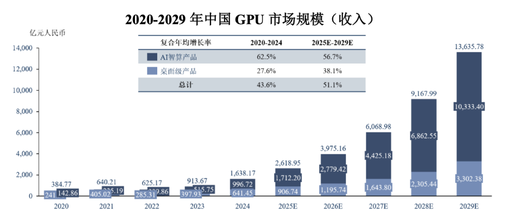 GPU是人工智能的“最强大脑”。根据弗若斯特沙利文预测,全球GPU市场规模预计在2029年将达到36119.74亿元,其中中国GPU市场规模在2029年将达到13635.78亿元,在全球市场中的市场占比预计将从2024年的30.8%提升至2029年的37.8%。