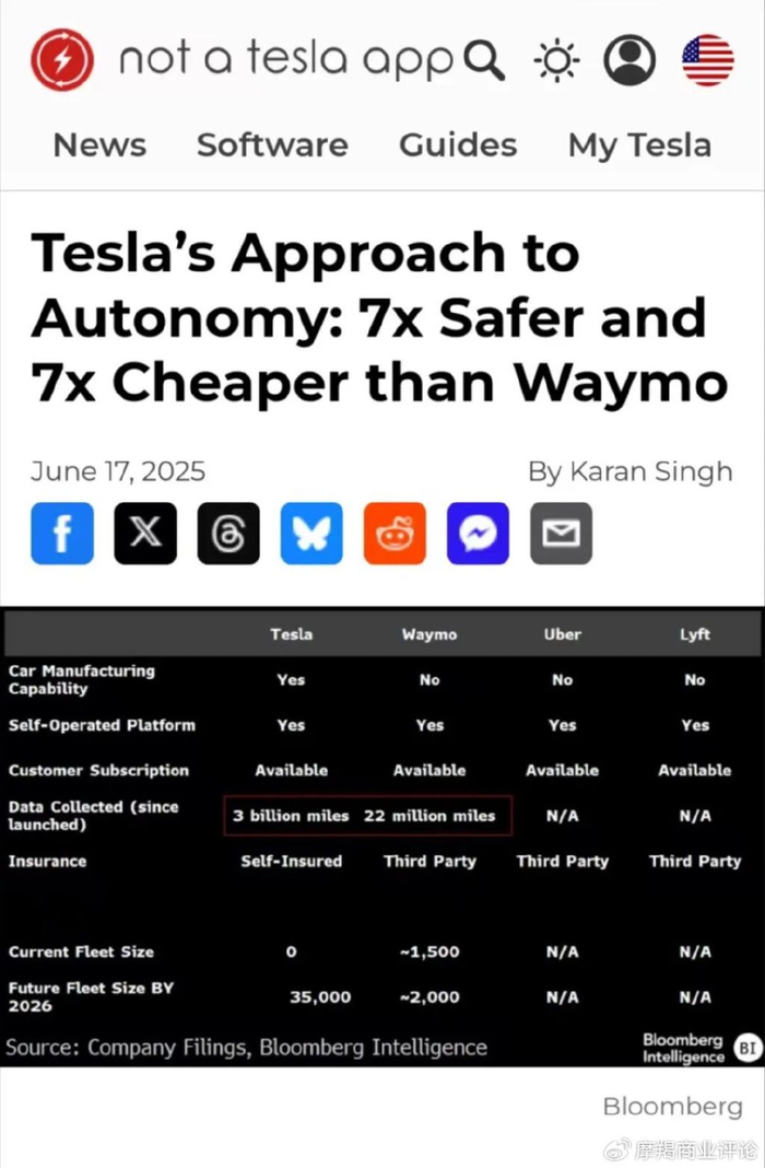 美国的权威媒体在2025年夏天做过一个研究,结论是 特斯拉 Robotaxi的成本仅是Waymo Robotaxi的1/7,安全性却是Waymo的7倍!