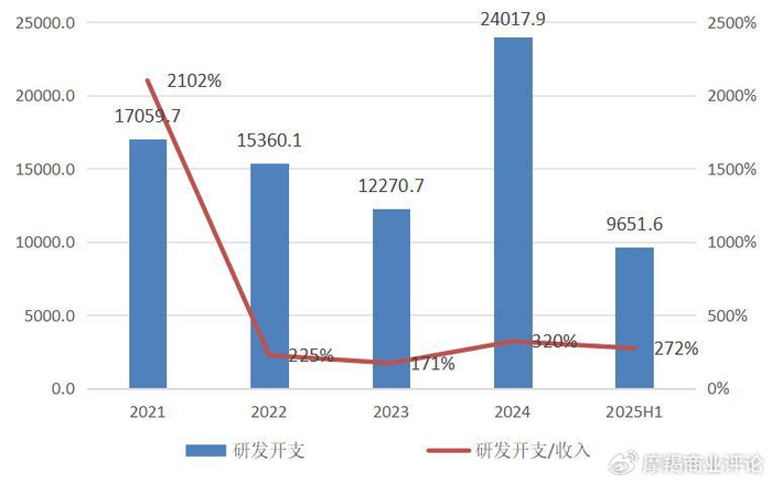 文远知行 从2021年到2025年上半年的研发开支总和达到39.96亿元人民币,超过净亏损的一半,且研发开支与收入的比重达到245%。
