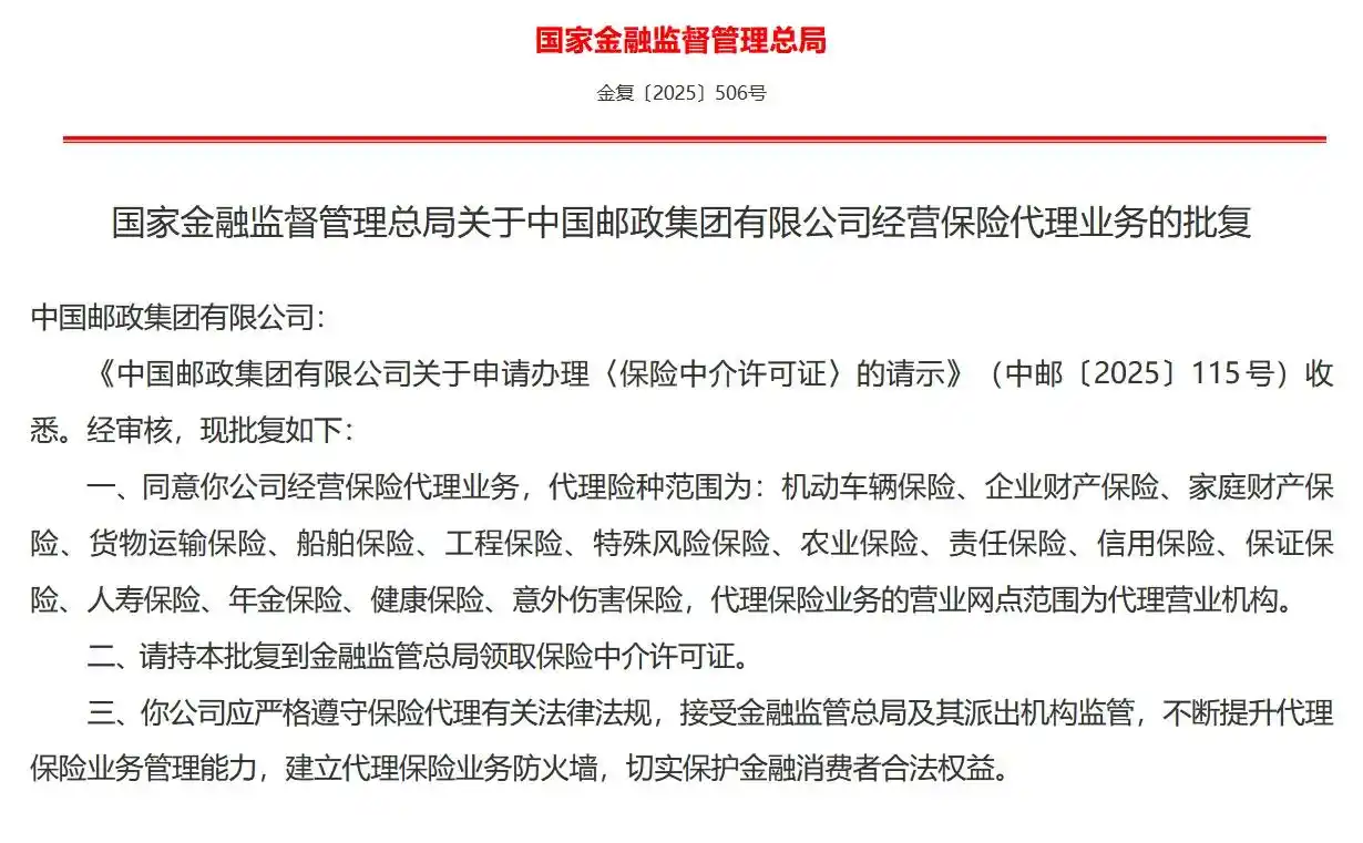 11月24日,国家金融监督管理总局发布批复,同意中国邮政集团有限公司经营保险代理业务,代理险种范围为:机动车辆保险、企业财产保险、家庭财产保险、货物运输保险、船舶保险、工程保险、特殊风险保险、农业保险、责任保险、信用保险、保证保险、人寿保险、年金保险、健康保险、意外伤害保险,代理保险业务的营业网点范围为代理营业机构。